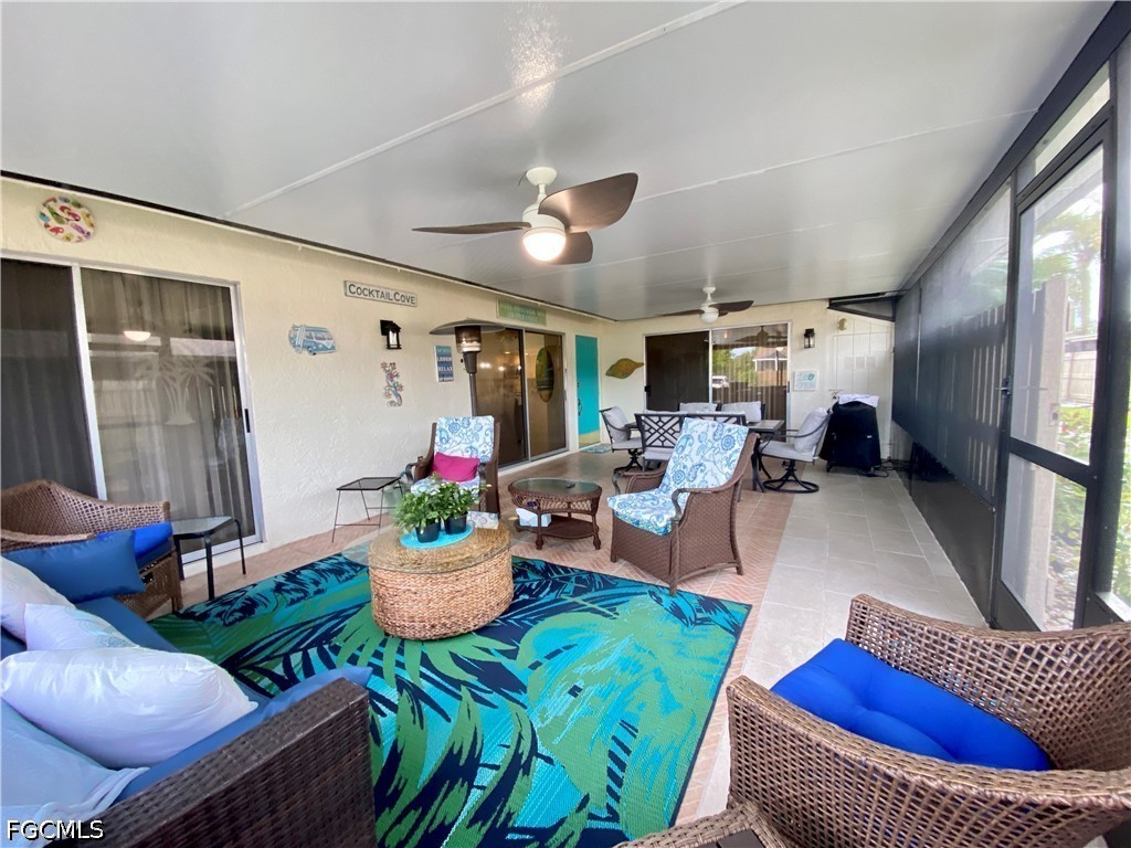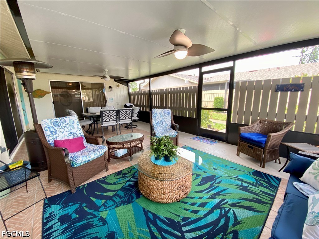 The living room and both bedrooms feature sliding glass doors that open to the private courtyard. The screened and fenced courtyard includes a new oversized covered patio with an insulated roof, providing comfort and shade year-round. The lanai fencing includes fold-down sections for added natural light and ventilation, plus a built-in storage shed.