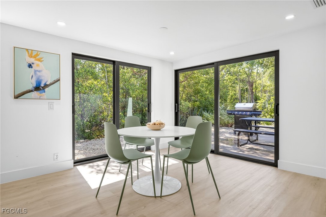 This 4-bedroom, 3-bath residence has been completely reimagined with high-end finishes and smart design, blending modern comfort with coastal charm. Every detail shines—from quartz countertops and custom cabinetry to waterproof luxury vinyl plank flooring and impact-rated windows and doors. The open-concept kitchen, living, and dining areas create a bright, welcoming space perfect for entertaining or relaxing after a day at the beach. The home’s expanded layout includes a brand-new guest suite and a spacious ensuite primary bedroom, ideal for vacation rentals or multigenerational living. Outdoors, enjoy a newly built private boat dock with rope accents and power hookup, an elevated patio deck, and lush tropical landscaping complete with a rope-lined beach walkway. The location couldn’t be better—just a short stroll or bike ride to Lighthouse Beach, Wickie’s, and The Magic Bus, and with quick access on and off the island via the Sanibel Causeway.