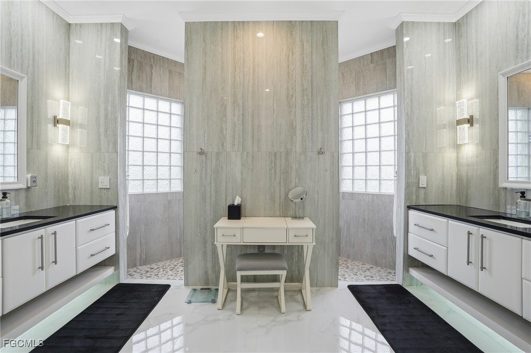 Inside the home, the atmosphere is modern, refined, and quietly luxurious. The Gourmet kitchen blends gas cooking with upgraded appliances with pot filler and smart-home convenience, while the master suite feels like a private spa—complete with floor-to-ceiling tile, dual walk-in closets, an oversized shower with multiple heads and sprayers, and a bidet.