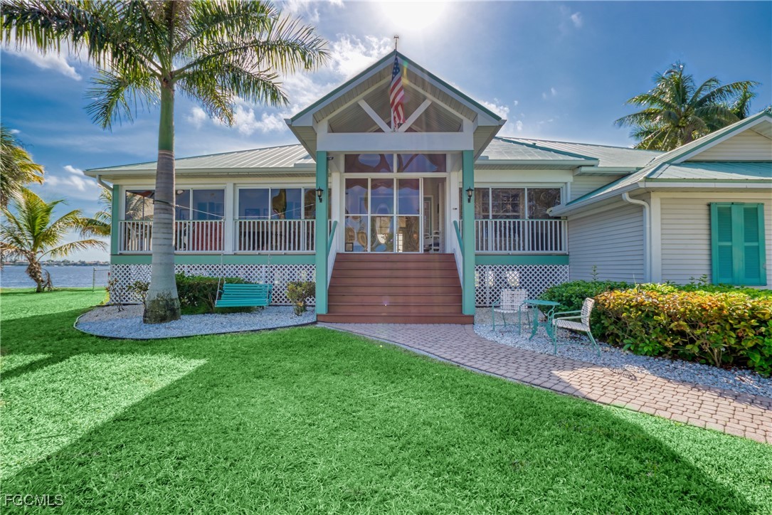 Best Location in Cape Coral! This iconic Key West-style villa rests atop a Premier Location in Cape Coral! This home is situated on an expansive Oversized River Lot at Redfish Point and offers breathtaking, 270-degree Panoramic Views of the River, providing a daily spectacle of natural beauty. Constructed on 50 concrete pilings, the finished floor is elevated five feet above ground level. A winding paver driveway and walkway lead to this distinctive Florida residence, featuring two enclosed porches that add nearly 1,000 square feet of additional living space, perfect for enjoying the Southwest Florida lifestyle.