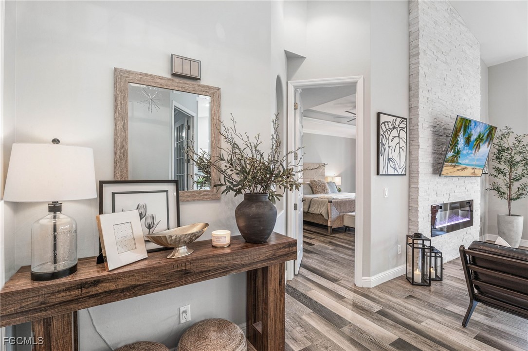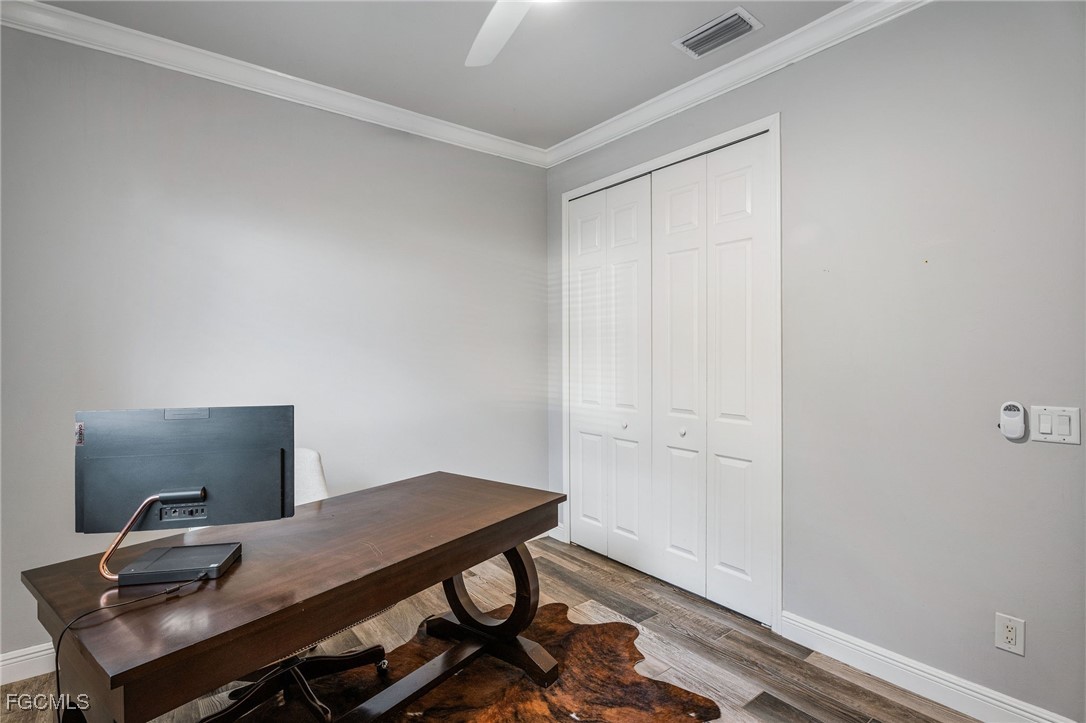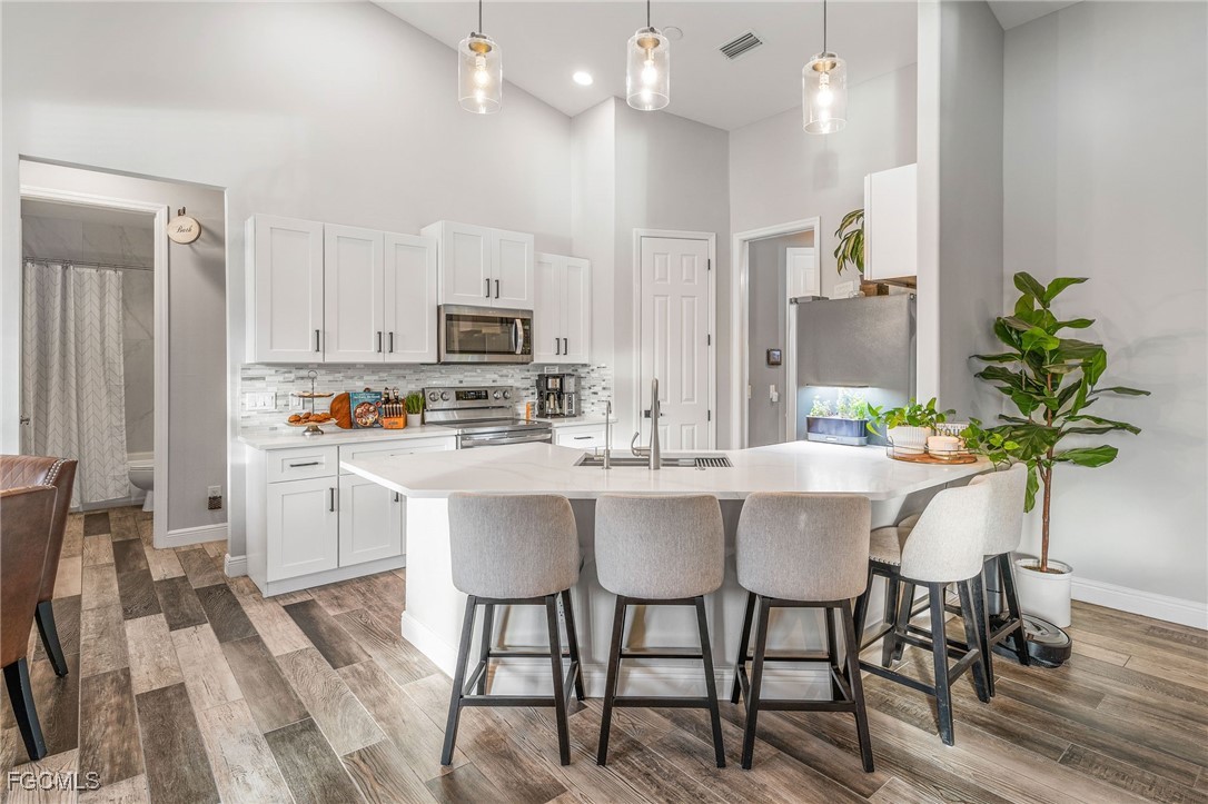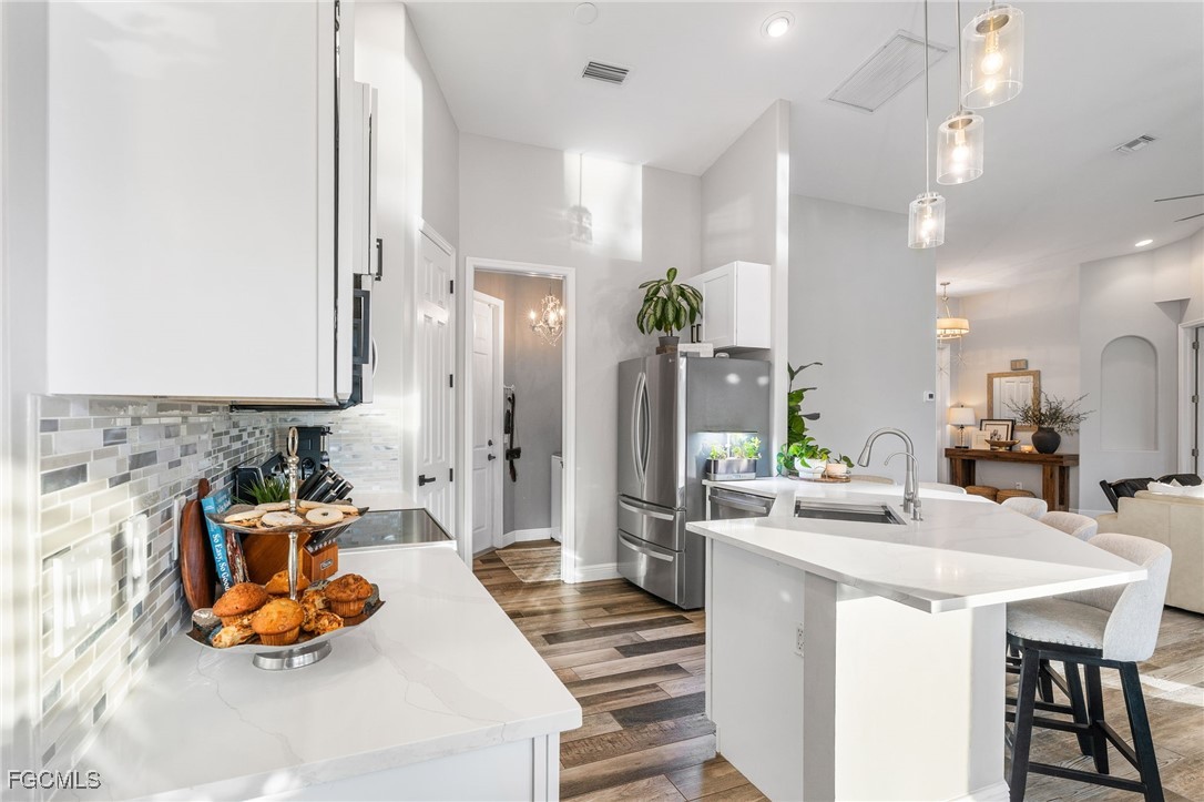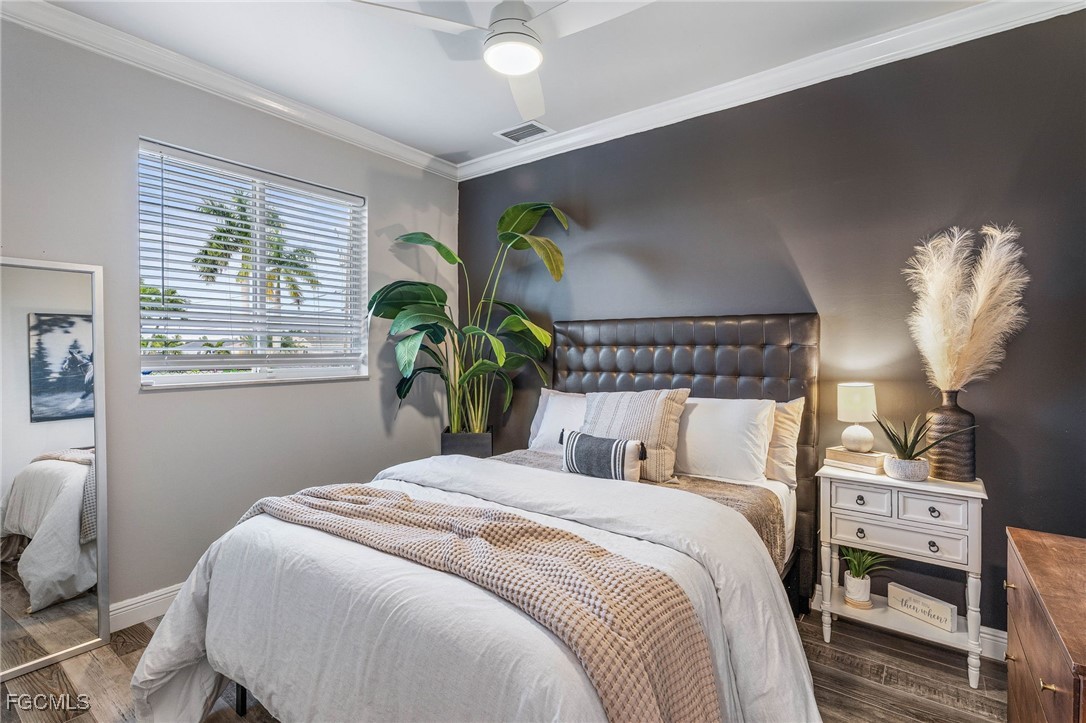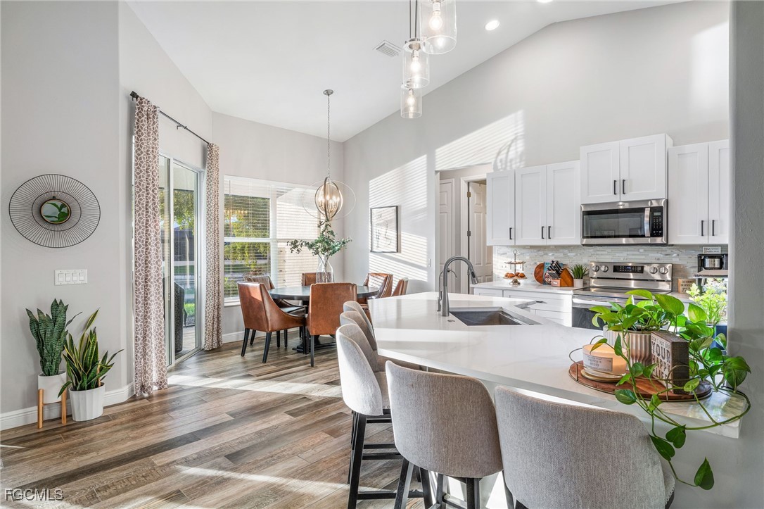 BREATHTAKING SUNSETS!!! Enjoy the most beautiful sunset views over an intersecting canal with coveted western exposure from this elegantly updated Cape Coral Freshwater Canal home. This residence offers three bedrooms plus a den (which is currently used as a gym), two bathrooms, and 1,754 square feet of thoughtfully designed living space. The open floor plan features soaring ceilings, plank tile flooring throughout, quartz countertops, stainless steel appliances, and new wood cabinetry, all complemented by abundant natural light from three sets of sliding glass doors. The oversized primary suite provides ample space for a reading nook and is enhanced by elegant crown molding, which continues throughout every bedroom. Step outside to the expansive screened lanai with picture screens, creating an unobstructed waterfront view, along with a convenient storage room and wiring in place for a future hot tub. Lush landscaping adds to the home’s privacy and curb appeal. Additional features include Kevlar hurricane shutters for the entire home, an under the sink APEC 7-stage water filtration system with UV light for drinking water, a NEW ROOF installed in 2022, and a NEW HOT WATER HEATER 2022. Best of all, this home has NEVER FLOODED AND IS NOT IN A FLOOD ZONE. A rare combination of updates, peace of mind, and spectacular waterfront living—this home is truly move-in ready. This home is on City water and Sewer with a very small assessment balance left that will be paid off by the Seller at closing.