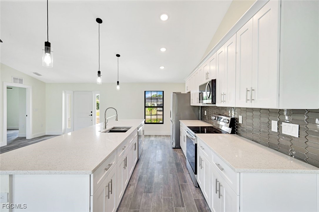 Nueva y hermosa casa de 4 habitaciones y 3 baños FRENTE AL AGUA en LOT TRIPLE Y GRANDE, construida en bloques de hormigón, en la codiciada zona noreste de Cape Coral, en Gator Circle que tiene un parque communidad con senderos para caminar, parque infantil, baloncesto, tenis y pickleball. El vendedor está dispuesto a contribuir a los gastos de cierre del comprador. Vea el recorrido virtual. ¡NO SE ENCUENTRA EN ZONA INUNDABLE! Este popular modelo Verona incluye una amplia y luminosa sala de estar de concepto abierto con pisos de baldosas, techos altos y puertas corredizas de 3 paneles que permiten la entrada de abundante luz natural y ofrecen vistas al agua. La luminosa cocina de chef cuenta con una enorme isla, gabinetes modernos con cierre suave, encimeras de cuarzo y un acogedor rincón para desayunar. La espaciosa habitación principal tiene un luminoso baño privado con encimeras de cuarzo, lavabos dobles, una ducha de azulejos y puerta de vidrio, y vestidor walk-in. Una segunda habitación principal opcional cuenta con un baño moderno y luminoso y acceso directo a la espaciosa terraza. Dos dormitorios adicionales y un tercer baño ofrecen mucho espacio para niños, invitados, una sala de estar, un espacio flexible o una oficina en casa. Ubicada junto a un canal navegable, disfrute de un día de pesca o simplemente explore los canales en paddleboard o kayak. En un vecindario IDEAL PARA FAMILIAS, con fácil acceso a áreas para ir de compras, comer, divertirse y a poca distancia en auto de las famosas playas de arena blanca de Florida. ¡Programe su visita hoy mismo! ~~~~~~~ Brand new, beautiful WATERFRONT 4 bedroom/3 bath concrete block home on an OVERSIZED TRIPLE LOT in desirable NE Cape Coral, in the Gator Circle neighborhood with a community park with walking trails, playground, and basketball, tennis and pickleball courts. NO FLOOD ZONE! This popular Verona model features a large and bright open-concept living space with tile floors throughout, soaring cathedral ceiling and 3-panel sliding doors for natural light and VIEWS TO THE WATER. The bright chef's kitchen features a huge island, modern cabinetry, Quartz countertops, stainless steel appliances, and relaxing breakfast nook. The large owner's bedroom has a bright ensuite bath with Quartz counter tops, dual sinks, a tiled step-in shower with glass enclosure, and walk-in closet. An optional SECOND OWNER'S SUITE has a bright, modern bathroom and direct access to the spacious lanai. Two more bedrooms and a third bathroom provide lots of room for kids, guests, a den, a flex space or a home office. Situated on a navigable canal, enjoy a day of fishing or simply exploring the waterways via paddleboard or kayak. In a family-friendly neighborhood with convenient access to areas for shopping, dining, entertainment, and Florida's famous white-sand beaches. Schedule your showing today!