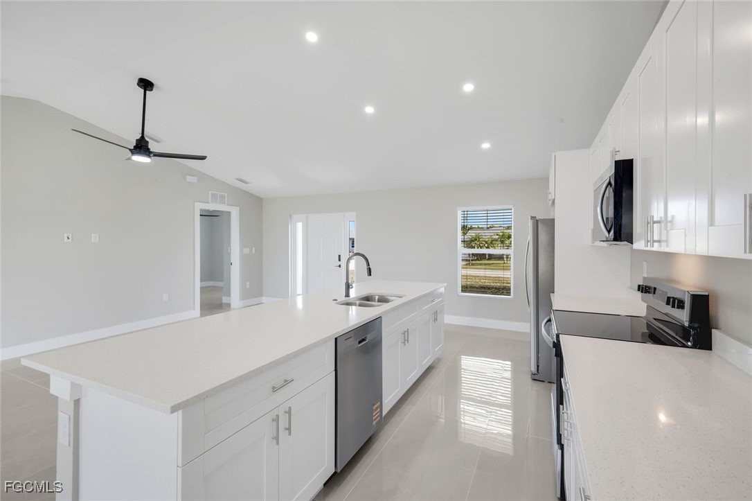 Nueva y hermosa casa de 4 habitaciones y 3 baños construida en bloques de hormigón, en la codiciada zona noreste de Cape Coral. El vendedor está dispuesto a contribuir a los gastos de cierre del comprador. Vea el recorrido virtual. ¡NO SE ENCUENTRA EN ZONA INUNDABLE! Este popular modelo Verona incluye ventanas y puertas resistentes a huracanes (no se necesitan contraventanas), una amplia y luminosa sala de estar de concepto abierto con pisos de baldosas, techos altos y puertas corredizas de 3 paneles que permiten la entrada de abundante luz natural y ofrecen vistas al jardin. La luminosa cocina de chef cuenta con una enorme isla, gabinetes modernos con cierre suave, encimeras de cuarzo y un acogedor rincón para desayunar. La espaciosa habitación principal tiene un luminoso baño privado con encimeras de cuarzo, lavabos dobles, una ducha de azulejos y puerta de vidrio, y vestidor walk-in. Una segunda habitación principal opcional cuenta con un baño moderno y luminoso y acceso directo a la espaciosa terraza. Dos dormitorios adicionales y un tercer baño ofrecen mucho espacio para niños, invitados, una sala de estar, un espacio flexible o una oficina en casa. En un vecindario IDEAL PARA FAMILIAS, con fácil acceso a áreas para ir de compras, comer, divertirse y a poca distancia en auto de las famosas playas de arena blanca de Florida. ¡Programe su visita hoy mismo! ~~~~~~~ Brand new, beautiful 4 bedroom/3 bath concrete block home in desirable NE Cape Coral. NO FLOOD ZONE! This popular Verona model features HURRICANE-RATED windows and doors (no shutters needed), a large and bright open-concept living space with tile floors throughout, soaring cathedral ceiling and 3-panel sliding doors for natural light and views to the rear yard. The bright chef's kitchen features a huge island, modern cabinetry, Quartz countertops, stainless steel appliances, and relaxing breakfast nook. The large owner's bedroom has a bright ensuite bath with Quartz counter tops, dual sinks, a tiled step-in shower with glass enclosure, and walk-in closet. An optional SECOND OWNER'S SUITE has a bright, modern bathroom and direct access to the spacious lanai. Two more bedrooms and a third bathroom provide lots of room for kids, guests, a den, a flex space or a home office. In a family-friendly neighborhood with convenient access to areas for shopping, dining, entertainment, and Florida's famous white-sand beaches. Schedule your showing today!