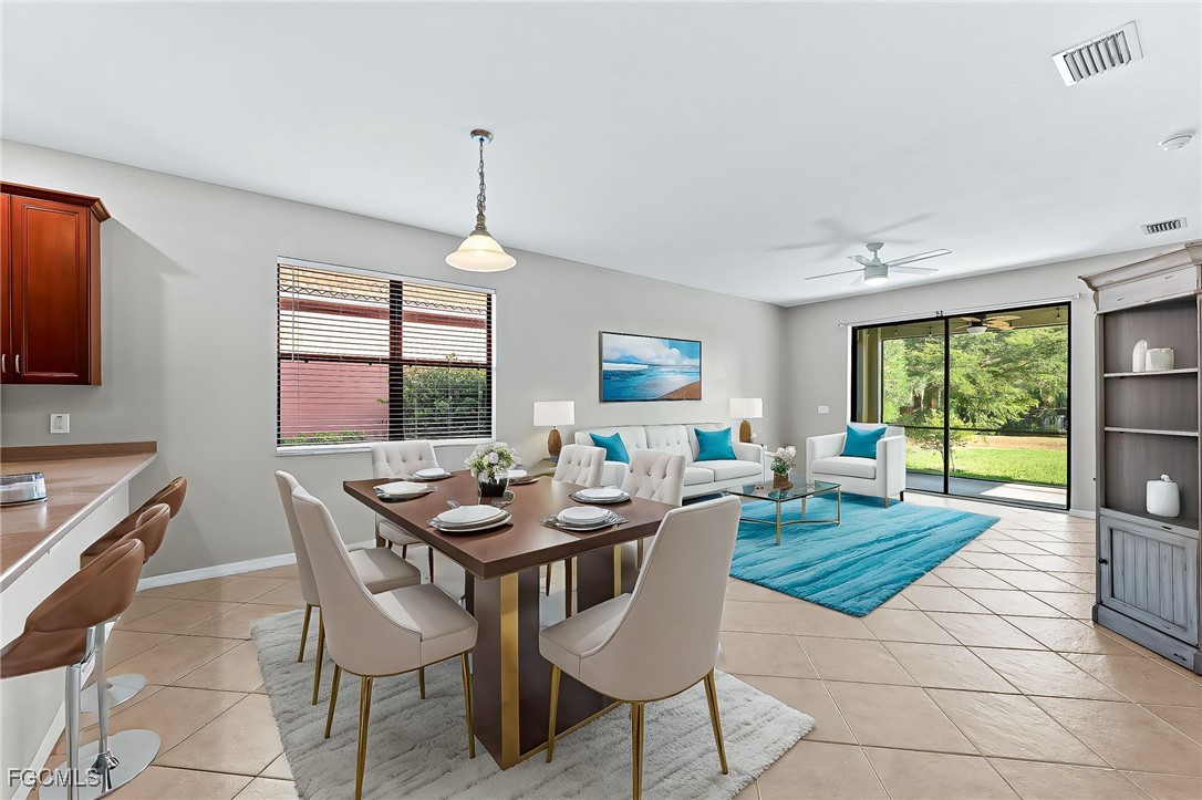 The kitchen opens to the main living space and maintains a practical layout for daily use. A formal dining room and dry bar with floating shelving provide defined spaces without overcomplicating the floor plan.