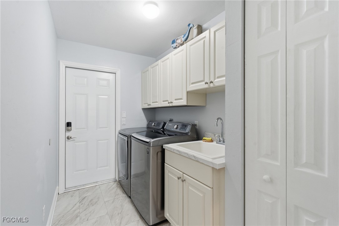 Additional highlights include an indoor laundry room with cabinet storage and wash sink, and an attached 2-car garage.