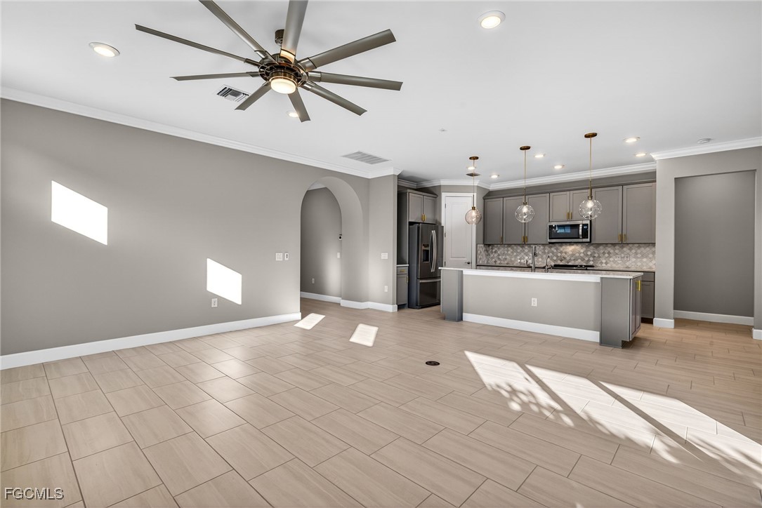 The chef-inspired kitchen serves as the centerpiece of the home, showcasing custom 42-inch cabinetry, quartz countertops, a marble backsplash, and a large island that overlooks the main living spaces. An added bonus is the Culligan water filtration system in the porcelain sink! Sliding doors lead to the private patio, where you can relax in your fully fenced backyard, complete with roll-down patio blinds and ceiling fans.