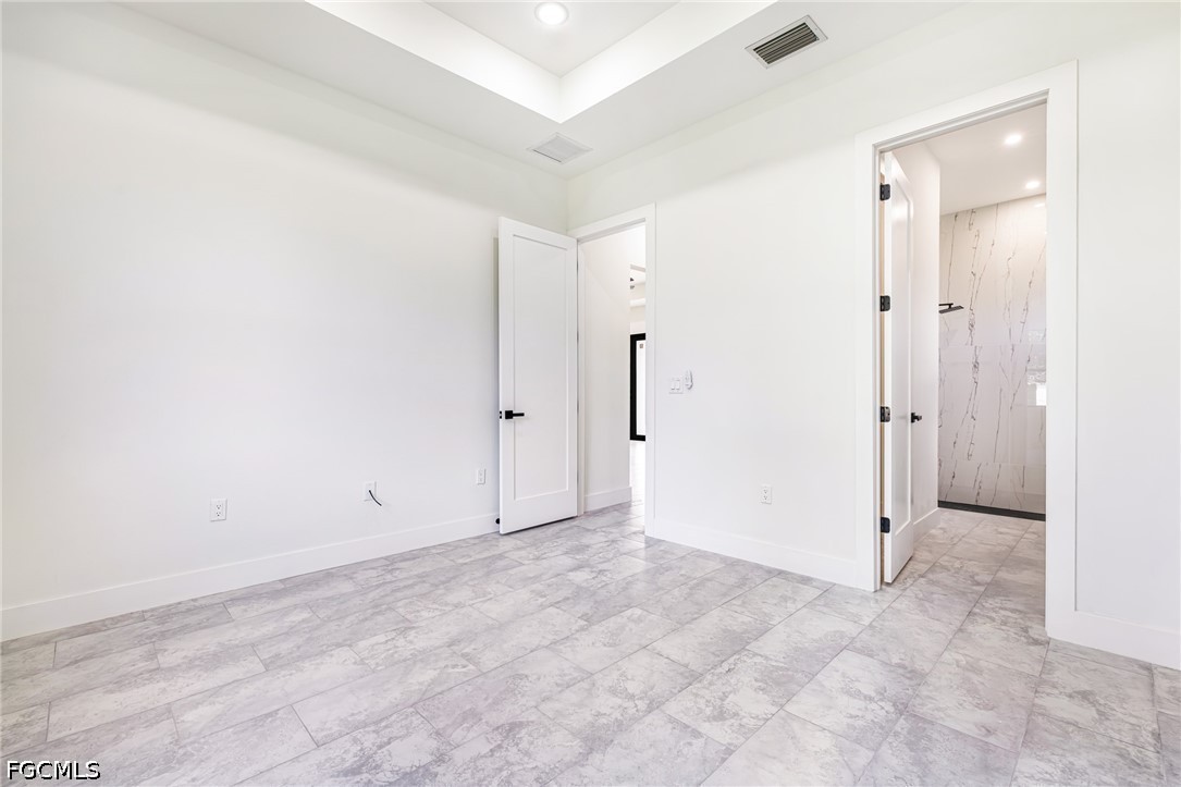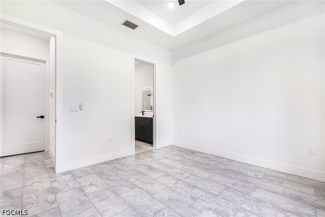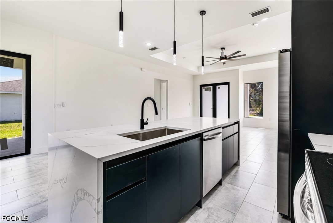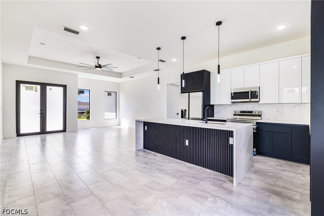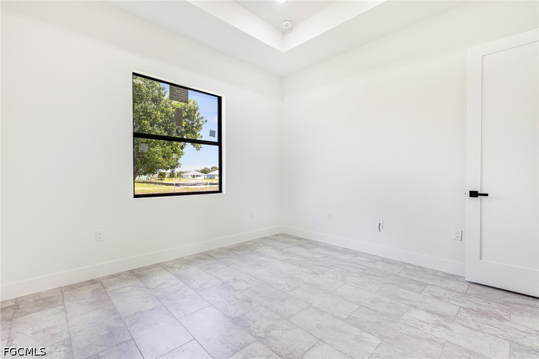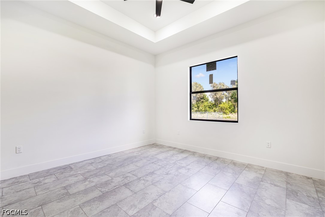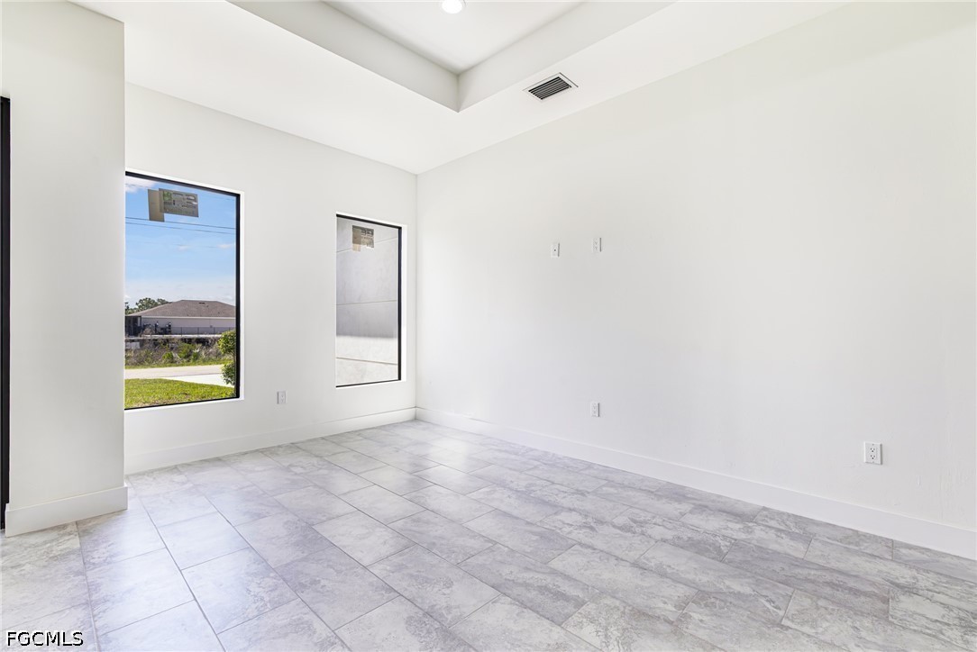Inside, enjoy open-concept layout featuring 10’–11’ tray ceilings, a grand double-door entry, and elegant 8’ interior doors throughout. The kitchen is a true centerpiece with European-style cabinetry, stainless steel appliances, and a stunning waterfall Quartz island—with a Quartz backsplash ideal for entertaining with USB outlets. Led Mirrors in both bathrooms of the home. Porcelain tile throughout the home to give it a modern natural stone look. Additional upgrades include Quartz countertops, dimmable soffit lighting, mat black fixtures, and fans throughout the home, including the covered patio.