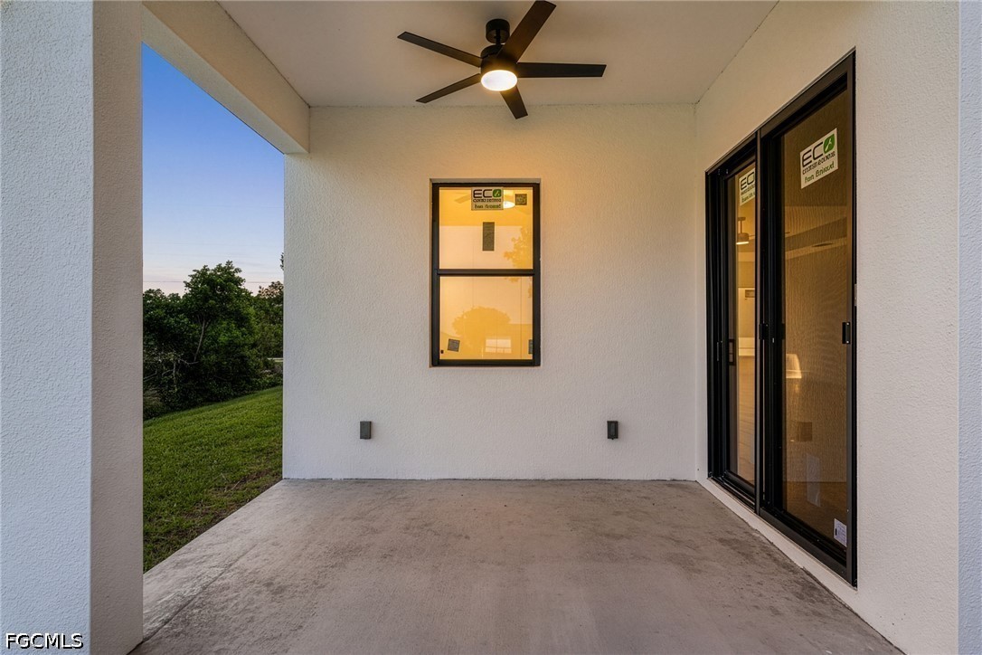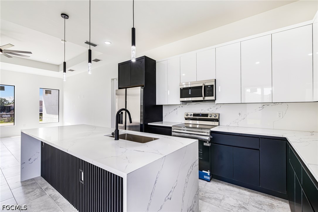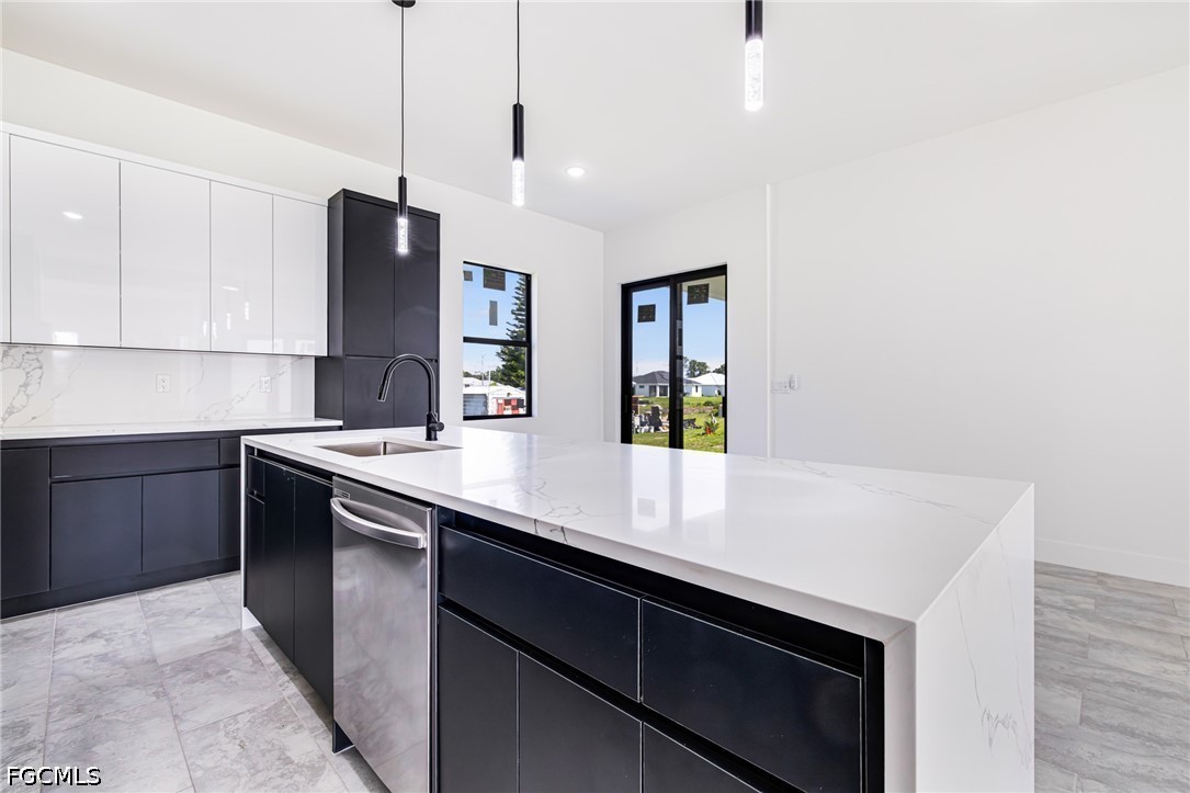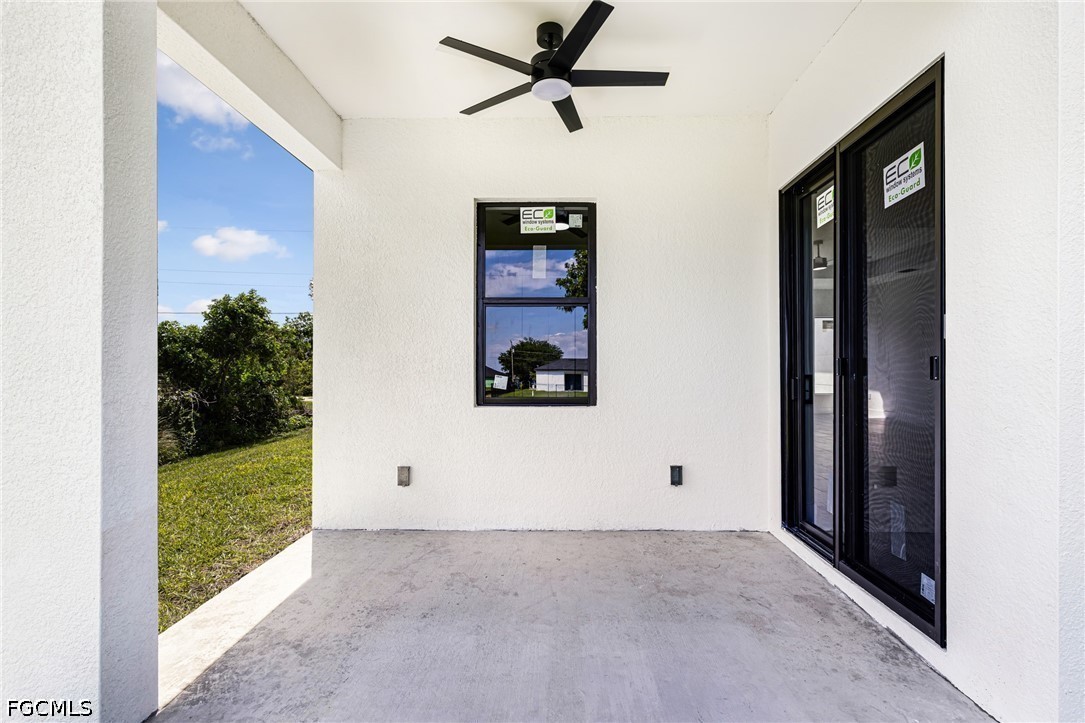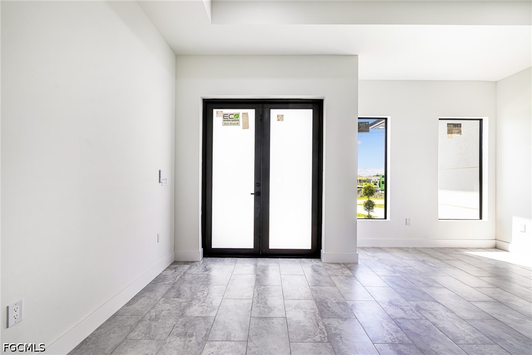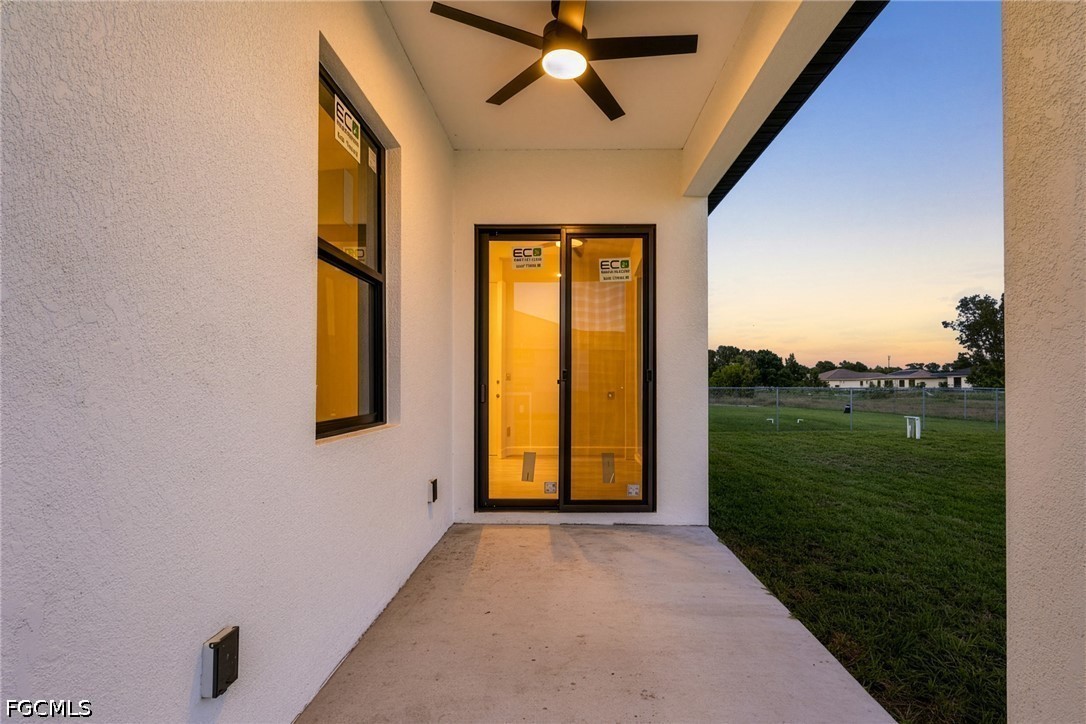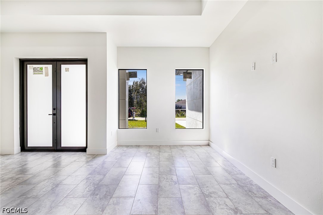 Inside, enjoy open-concept layout featuring 10’–11’ tray ceilings, a grand double-door entry, and elegant 8’ interior doors throughout. The kitchen is a true centerpiece with European-style cabinetry, stainless steel appliances, and a stunning waterfall Quartz island—with a Quartz backsplash ideal for entertaining with USB outlets. Led Mirrors in both bathrooms of the home. Porcelain tile throughout the home to give it a modern natural stone look. Additional upgrades include Quartz countertops, dimmable soffit lighting, mat black fixtures, and fans throughout the home, including the covered patio.