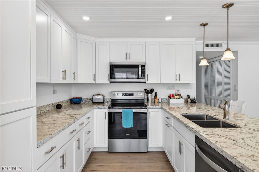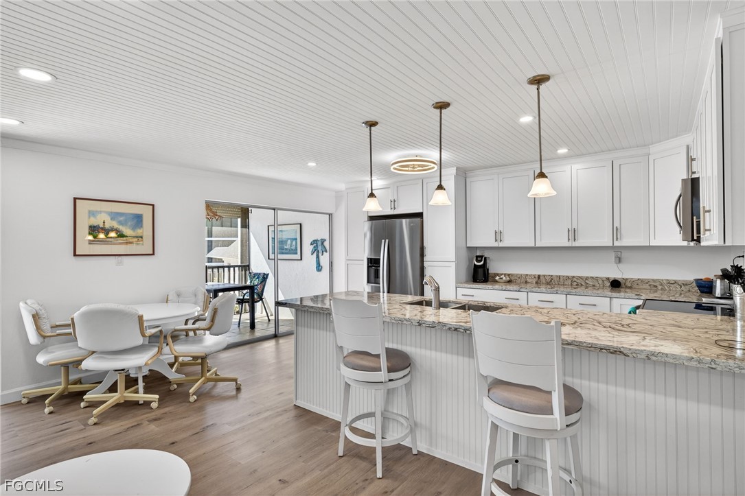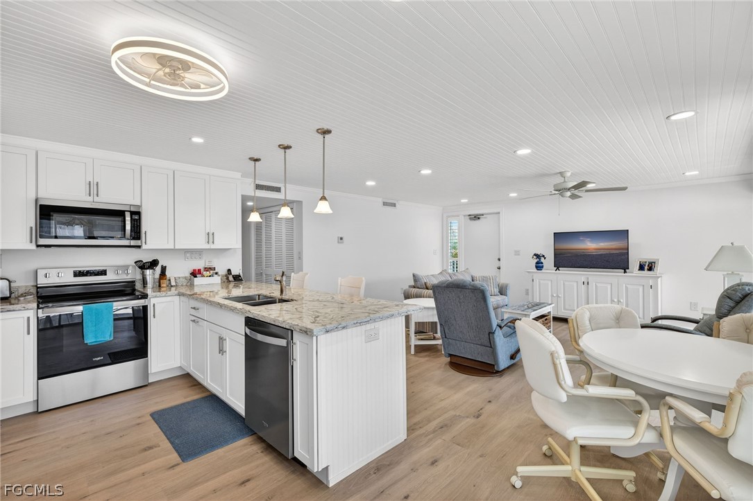The kitchen is both elegant and functional, featuring crisp white cabinetry, stone countertops, stainless appliances, and an expansive breakfast bar designed for casual dining and entertaining alike. The adjoining dining area flows seamlessly into the living space and out to the screened lanai, offering a natural extension of the interior and an inviting setting for enjoying gulf breezes.