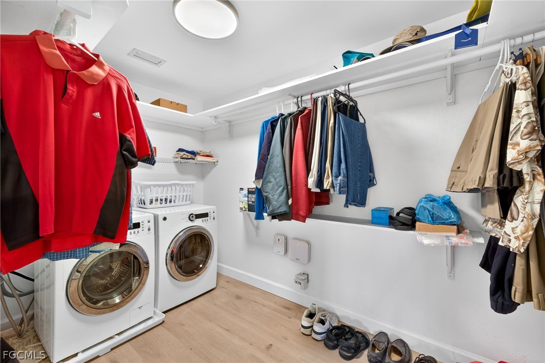 A private den provides versatile space ideal for a home office, media room, or additional guest accommodation. The primary suite serves as a tranquil retreat, complete with a spacious walk-in closet with an in-residence washer and dryer, and a beautifully renovated bath featuring a tiled walk-in shower and elevated finishes. The guest bedroom is generously sized and thoughtfully positioned near the second full bath, ensuring comfort and privacy for visitors.