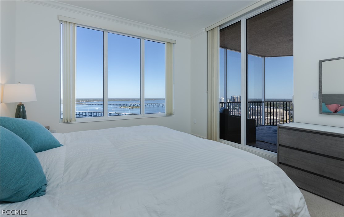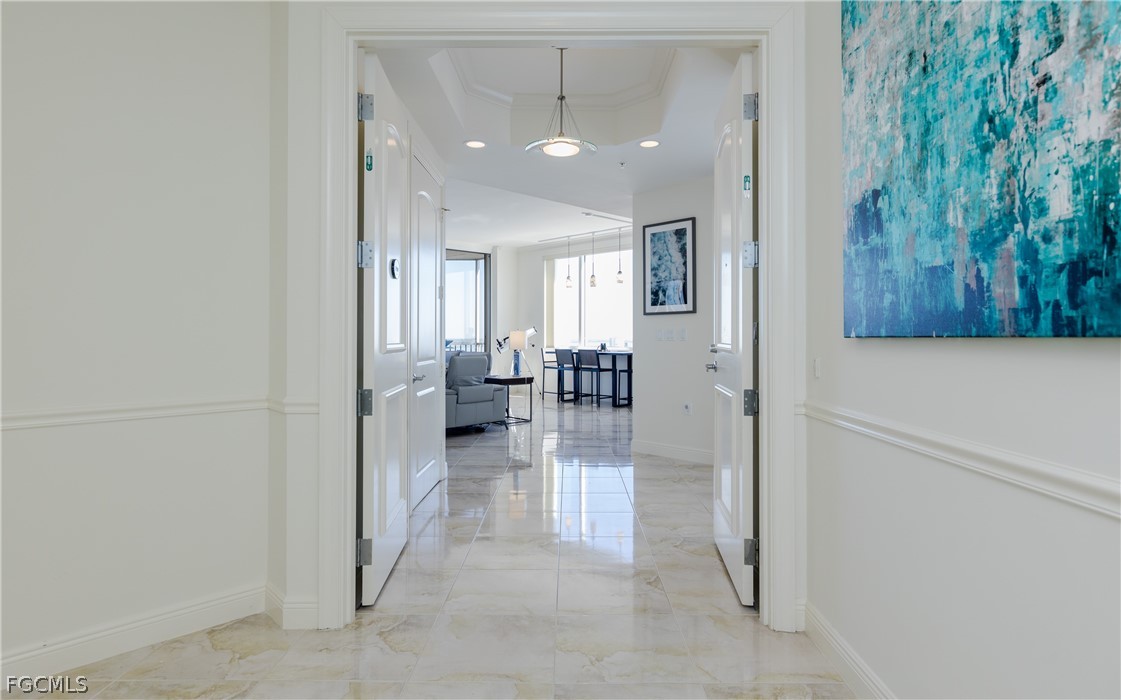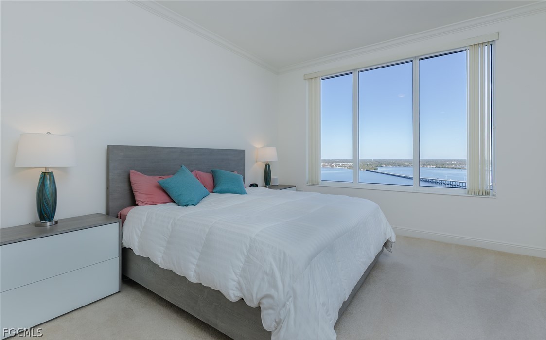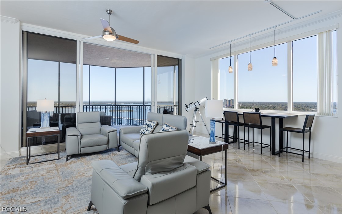 Discover luxury living in this spacious 1,779-square-foot corner penthouse, offering breathtaking water and downtown views. Step off the high-rise elevator into your private foyer and enjoy 10-foot ceilings, 8-foot doors, and elegant crown molding throughout. The upgraded tile floors lead to a bright living area, filled with natural light from floor-to-ceiling impact-rated sliding glass doors that open to a large balcony, perfect for watching fireworks on the 4th of July and New Year's Eve!