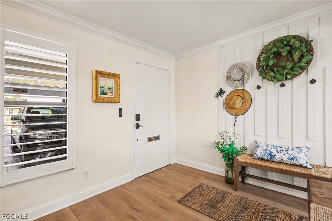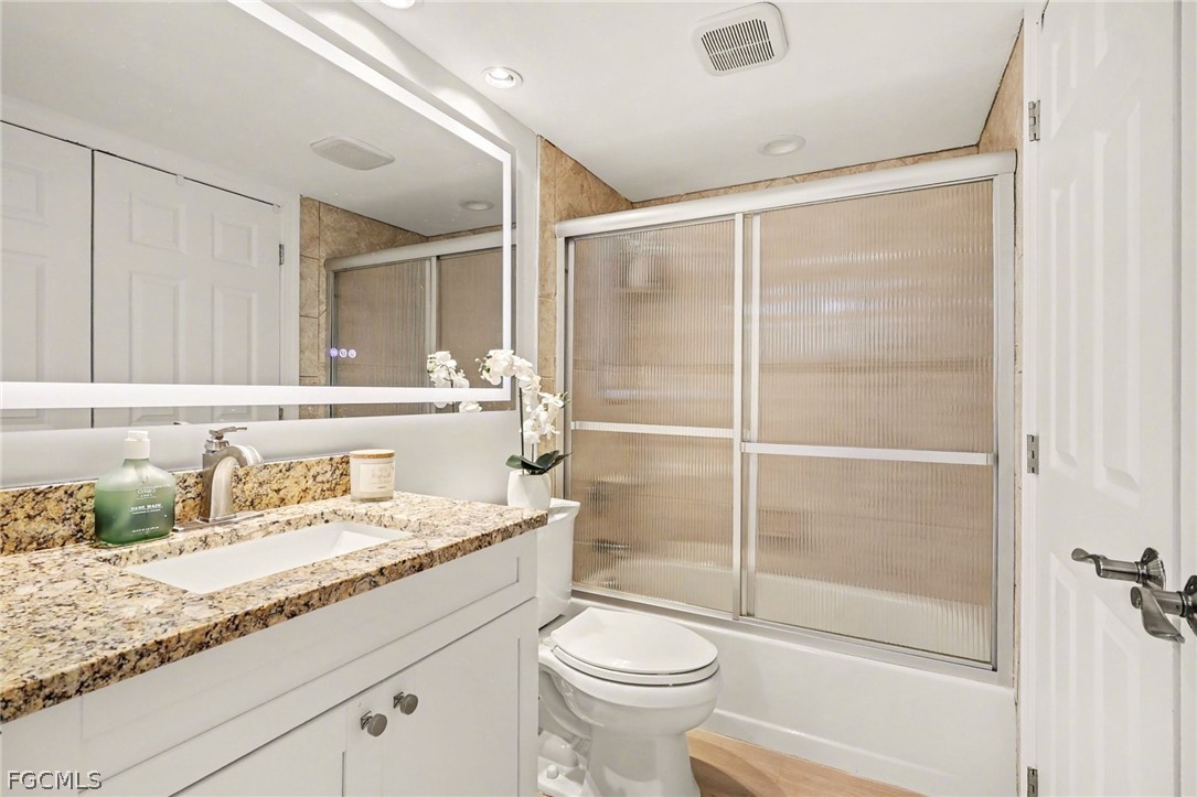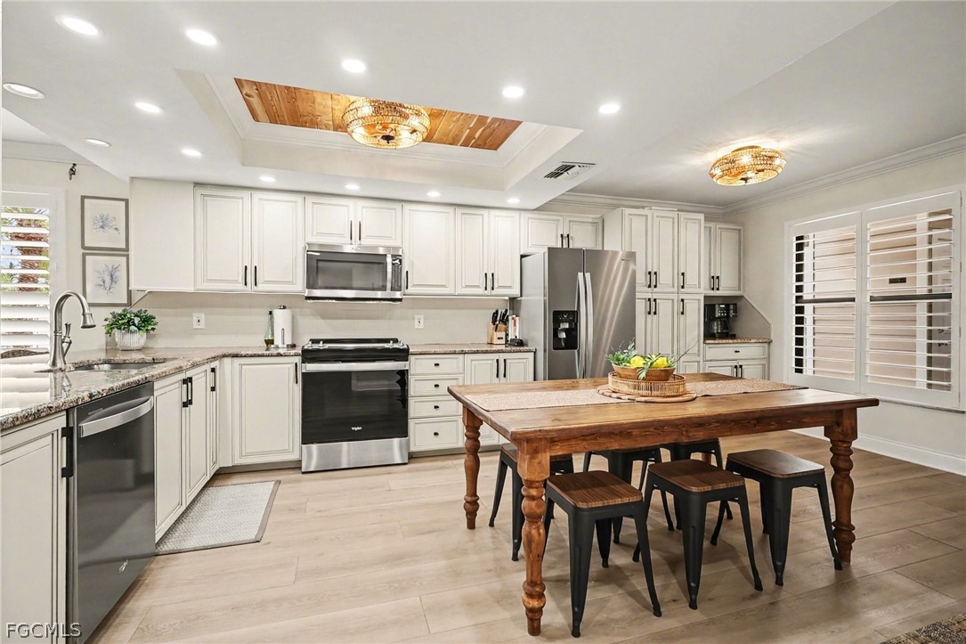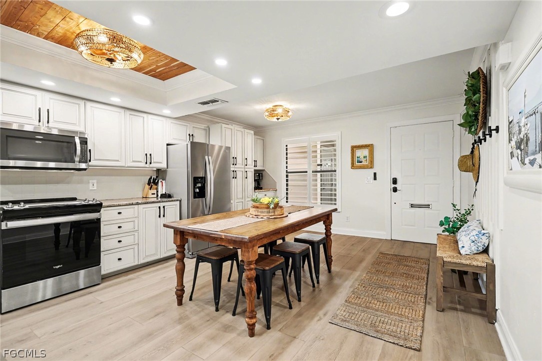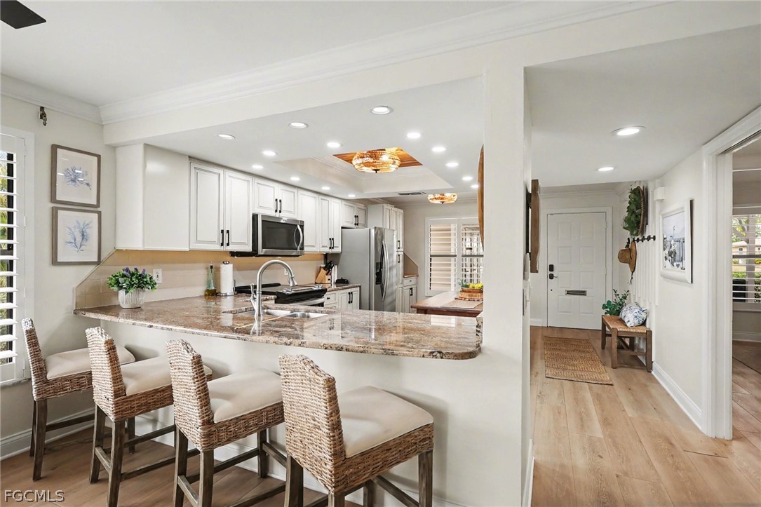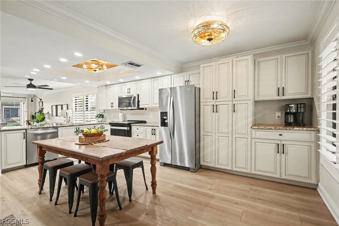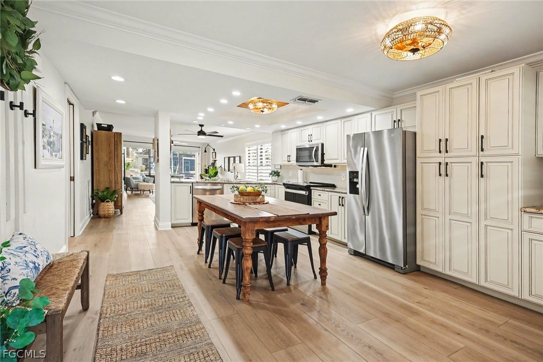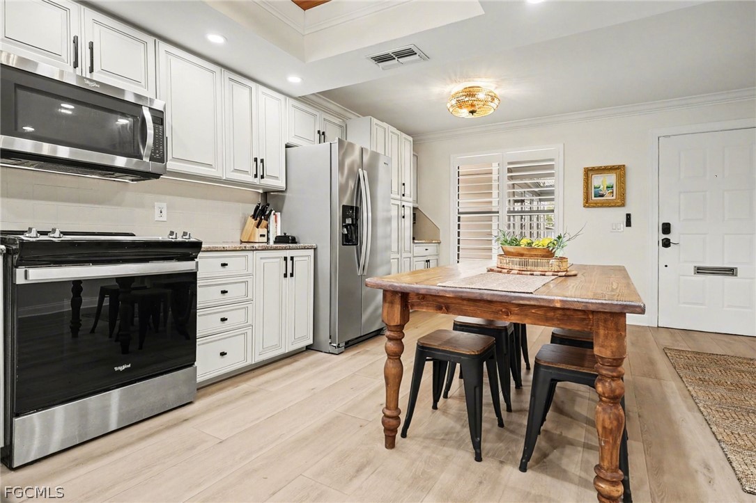The renovated interior features luxury laminate flooring, fresh paint, and updated fixtures that deliver a clean, modern feel. A high efficiency Carrier HVAC system ensures reliable comfort while keeping energy costs in check. Plantation shutters and motorized blinds on all sliding doors provide both elegance and everyday convenience. The spacious eat-in kitchen showcases 2023 stainless steel appliances and granite countertops, while contemporary LED mirrors brighten both bathrooms.
