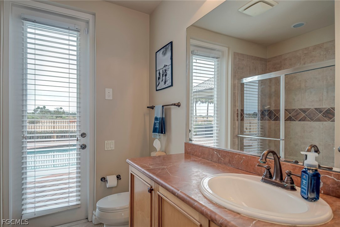 The family room flows seamlessly from the kitchen and is lined with glass doors that frame beautiful views of the pool and outdoor living areas. The luxurious primary suite serves as a private retreat, offering trey ceilings, direct pool access, and a spa-inspired bath with a walk-in shower, soaking jetted tub, and expansive walk-in closets. Downstairs also includes 3-4 additional bedrooms, including a versatile bonus room with pool bath access—perfect for a private guest suite, exercise room or studio.