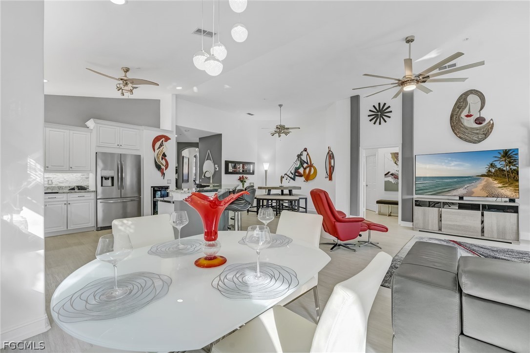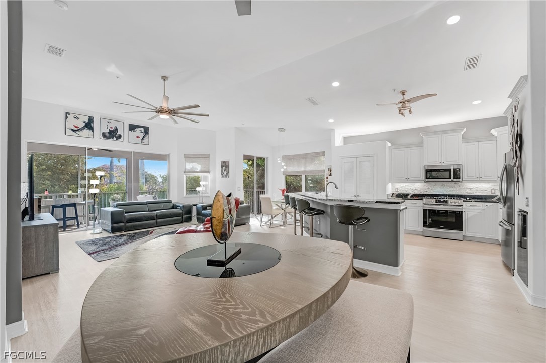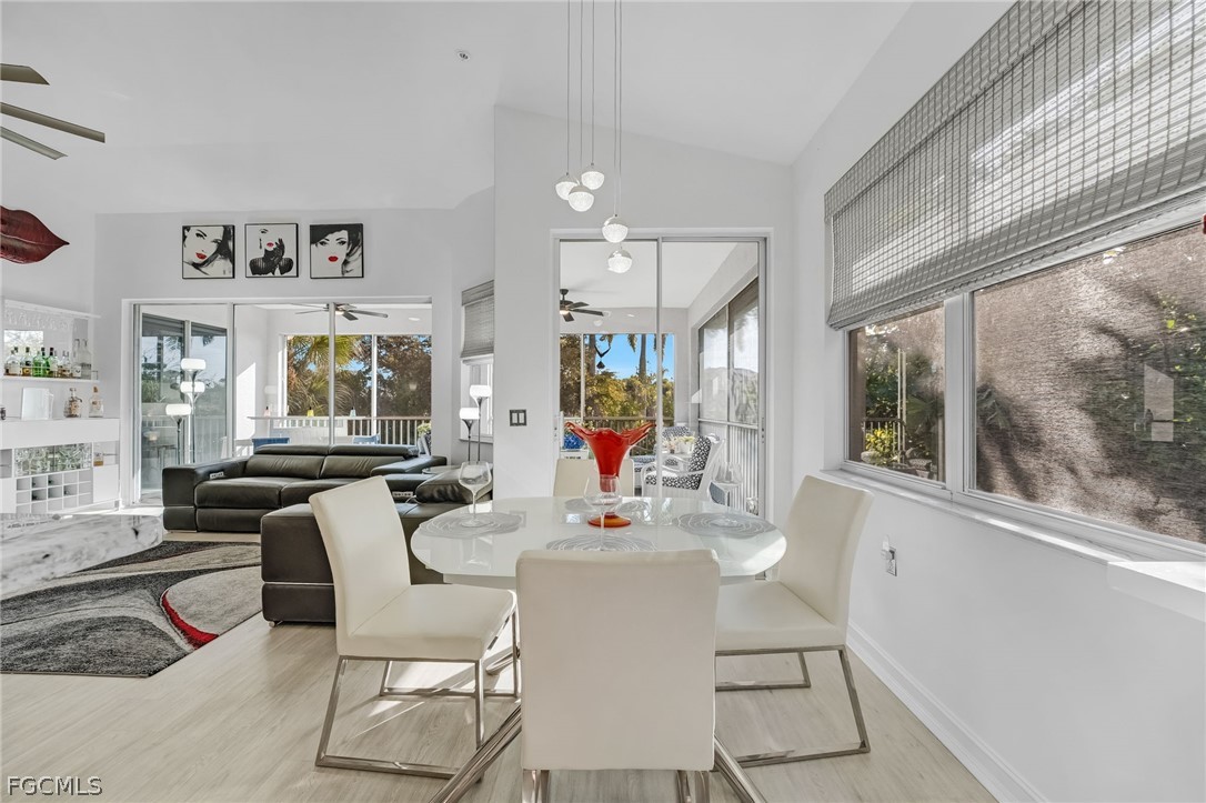 Tucked within the prestigious Mariposa community behind the gates of Gulf Harbour, this exceptional second-level residence offers over 2,300 square feet of sophisticated living space, highlighted by soaring 14-foot ceilings in the main living area. Expertly remodeled, the three-bedroom plus den, two-bath floor plan is appointed with elegant finishes and thoughtful design throughout. Natural light floods the expansive 260-square-foot wraparound screened lanai, east-facing for serene morning views, creating a tranquil and inviting ambiance that perfectly complements the home’s refined character.