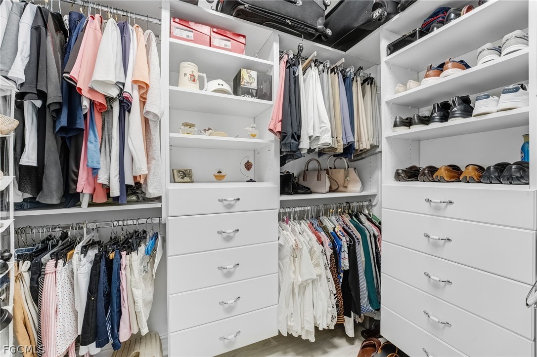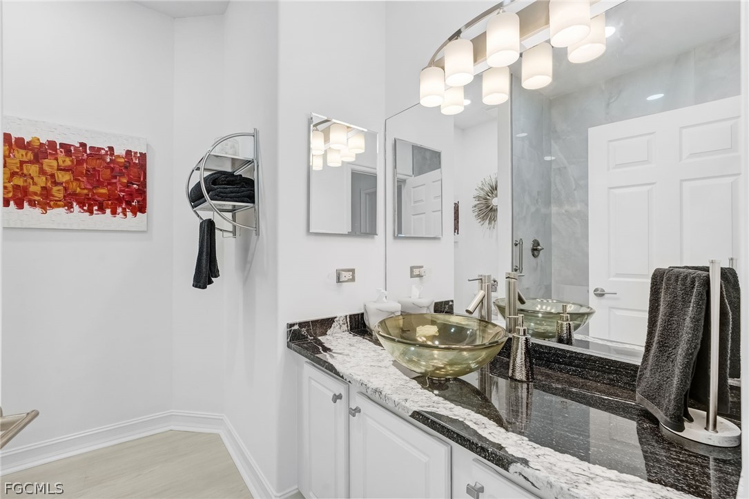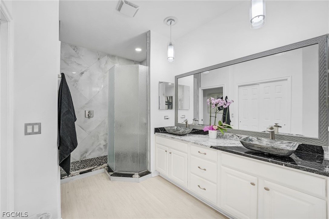 The private primary suite boasts direct lanai access, a tray ceiling, a custom walk-in closet, and a spa-inspired bath with vessel sinks, granite countertops, and a designer walk-in shower finished in floor-to-ceiling tile. Two additional generously sized bedrooms feature walk-in closets, complemented by a second full bath with a vessel sink and glass-enclosed shower.