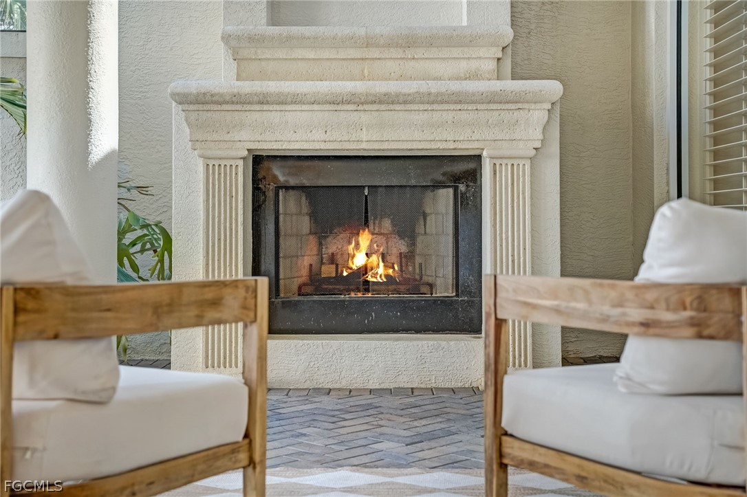 A grand 12-foot hand-carved wood entry door welcomes you into soaring ceilings, dramatic double tray ceilings with uplighting, and walls of 12-foot sliding glass doors that seamlessly blend indoor and outdoor living. The private courtyard is an entertainer’s dream, featuring a custom pool and spa, a fully equipped outdoor kitchen with grill, refrigerator, and sink, generous covered seating areas, and a charming wood-burning fireplace—perfect for relaxing on cooler Florida evenings.