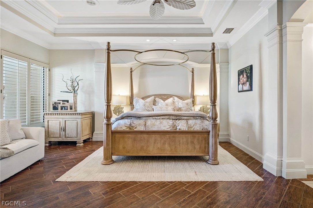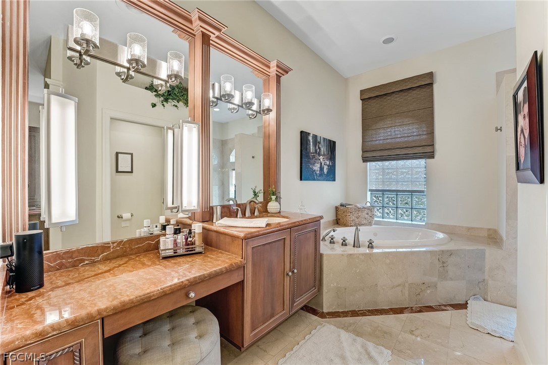 The luxurious primary suite offers a tranquil retreat with a spa-inspired bath that includes dual marble vanities, a dedicated dressing area, soaking tub, walk-through shower with dual showerheads, two private water closets, and dual custom walk-in closets.