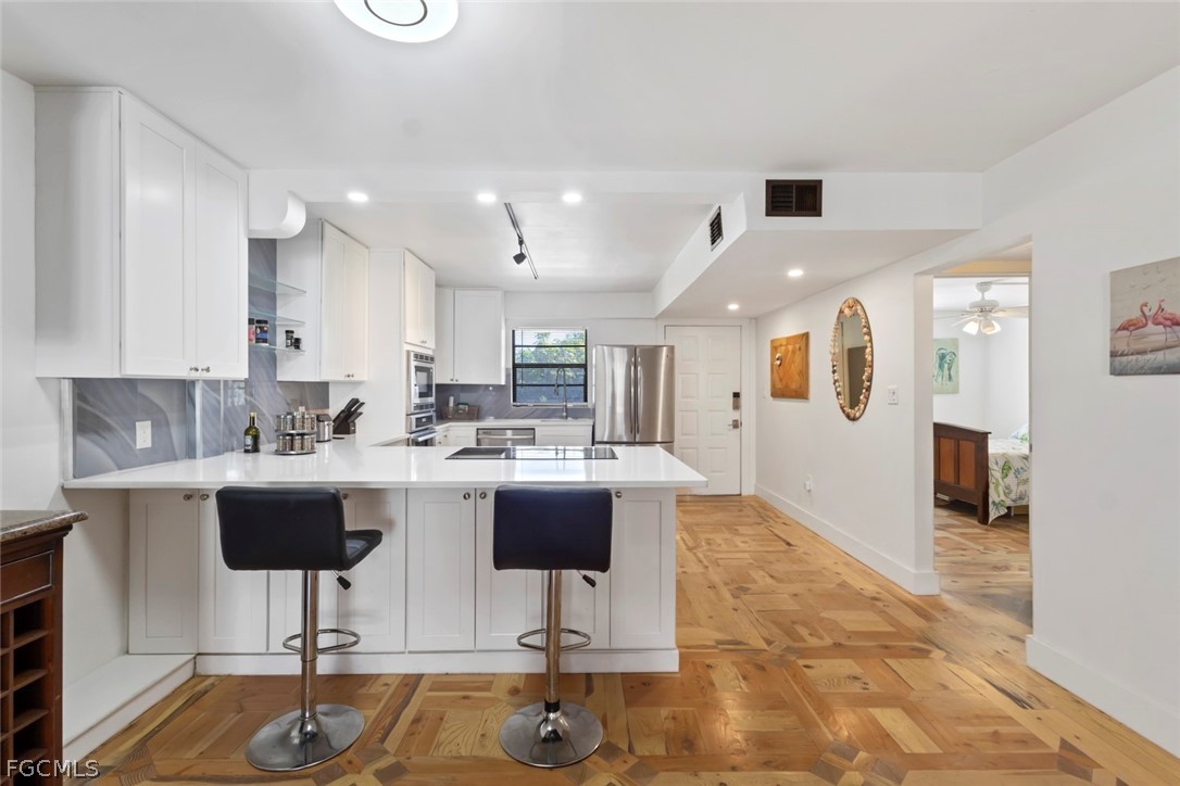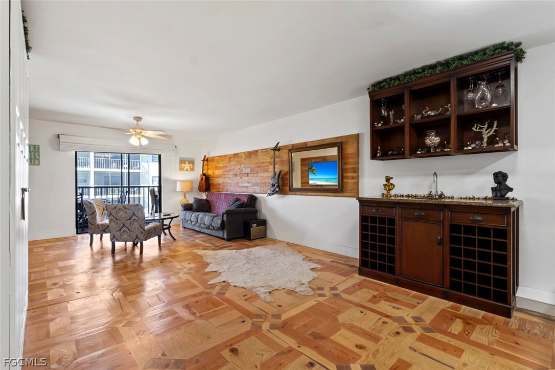 Welcome to Spanish Harbor in the heart of Bonita Springs, where Gulf-access boating and relaxed Southwest Florida living come together in this beautifully updated and fully furnished 2-bedroom, 2-bath condo. As you step inside, you’ll immediately notice over 6,000 pieces of hand-cut reclaimed timber forming exquisite custom parquet patterns throughout the floors, adding warmth, texture, and distinctive character that make this residence truly one-of-a-kind. The renovated kitchen blends style and function with a modern induction stovetop, stainless steel appliances, quartz countertops, and an in-wall oven, creating an inviting space for everyday living or entertaining. The open great room flows to a screened balcony overlooking the canal and pool area, while the split-bedroom floor plan provides privacy and flexibility. Both bathrooms have been tastefully updated, the bedrooms are well-appointed, and a built-in Murphy bed adds versatility for guests or additional sleeping space. Spanish Harbor is a boating community offering community Gulf access, boat slips available, a community dock, fish cleaning station, heated pool, tiki hut, BBQ/picnic areas, bike storage, and covered assigned parking. Just minutes from Downtown Bonita Springs, Riverside Park, local dining and shopping, and a short drive to the beaches, this property delivers the coastal lifestyle so many seek. With flexible leasing (up to 6 leases per year, 30-day minimum), this condo is ideal as a seasonal retreat, investment opportunity, or full-time residence in one of Bonita’s waterfront communities.