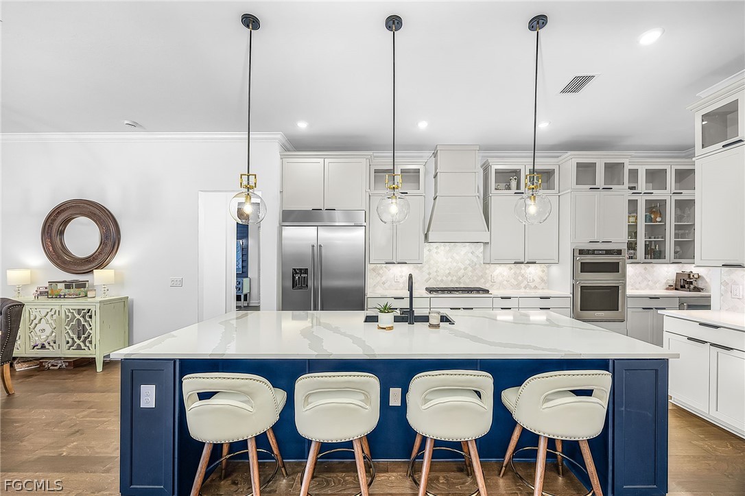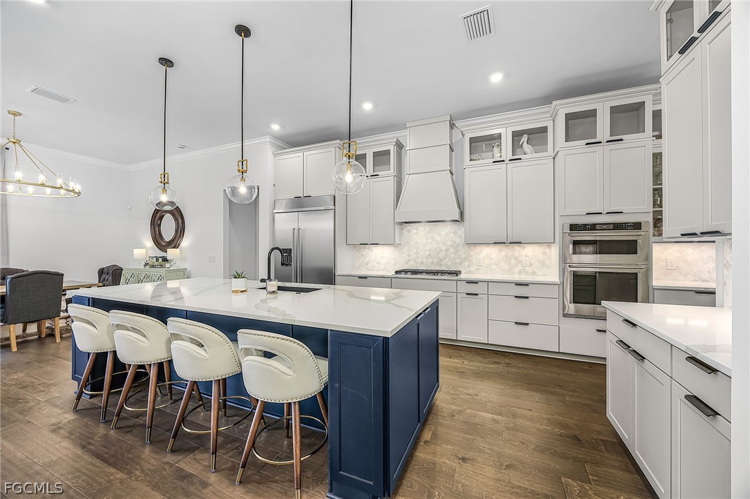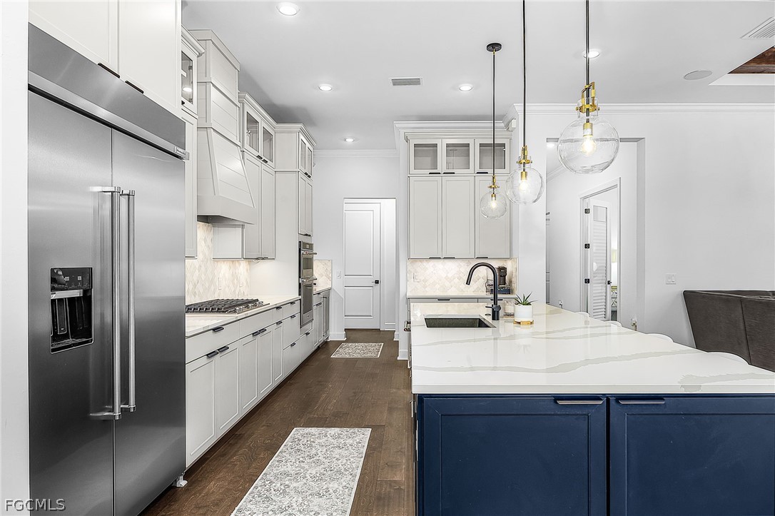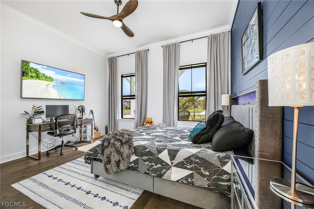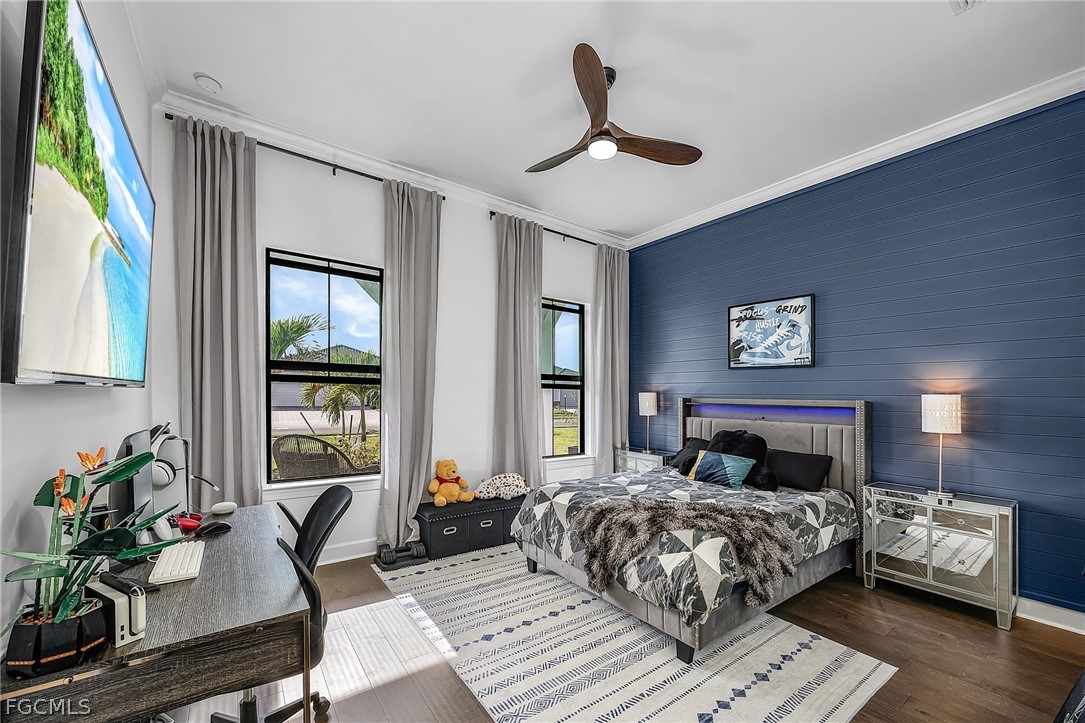 Your meticulous search ends here! Welcome to the highly desirable yet rarely available Renown model. Proudly sitting on an immense .28 acre lot with 95 ft frontage, professionally & elegantly finished by an Award Winning Top Tier Interior Design Team with no expenses spared. Arguably one of the most breathtaking & stunning lake views whilst offering under 2900 Sqft of living space all on one level without the torment of endless stairs. This remarkable home offers rare & rich engineered hardwood flooring throughout, 3 generous size bedrooms situated far apart for privacy and a Den that can be utilized as a 4th bedroom or home office. Custom closet organizers in all closets including the walk in pantry. The Primary bedroom has a massive walk-in closet and overlooks the breathtaking lake & pool. Entertain your family & friends in the top of the line chefs kitchen with the highest level upgrades, quartz countertops, built in stainless steel appliances including a 48" fridge, wine cooler, gas cooktop, massive island & walk in pantry. Two-toned cabinetry, arabesque marble backsplash & designer light fixtures adds warmth & brings it all together. Family room equipped with a custom entertainment unit, designer tile, built in fireplace, Samsung sound bar & subwoofer with deep bass perfect for movie nights or watching sporting events. The zero corner sliders lead you to the truly exceptional outdoor paradise with a custom designed heated, saltwater pool with spillover spa, sun deck with bubbler for the little ones or your furry friends, fountains, pool bath & panoramic view pool enclosure with Clusia privacy trees. A fully extended pool deck with large, white travertine paver stones & pre-plumbed for an outdoor kitchen. With a sought after floorplan, this home offers an oversized laundry room and a separate powder room that guests can use without having to enter any bedrooms. Abundant upgrades include Wood beam ceilings, crown molding throughout, designer light fixtures, faucets, vanity mirrors, accent walls in all bedrooms, frameless glass showers & upgraded shower tiles, quartz counters, custom drapery, ceiling fans, a three car garage with upgraded 4 ft extension & epoxy flooring, whole house water treatment system, pre-wired family room speakers, Wifi extenders & outdoor cameras and a garage outlet for electric vehicles. Verdana Village is one of the most sought after upscale communities. Indoor basketball, indoor/outdoor pickleball, tennis & ice cream parlor. Multiple breathtaking pools, hot tub, bars and restaurants with excellent culinary selections. Ride your golf cart to Publix, Liquor Store, UPS, Nail Salon, Award Winning Hair Salon, Dunkin Donuts, Physio, Italian Restaurant & more commercial amenities planned in the near future. A beautiful home with all the bells & whistles, sitting on a premium lot with stunning lake views in an upscale community fit for the most discerning buyer in an area that will only continue to grow. Welcome Home.