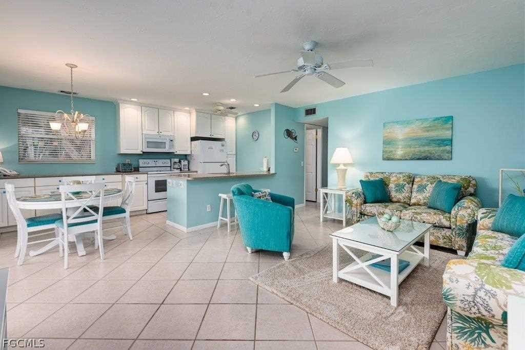 Inside the residence, you’ll find numerous updates already in place, including new impact windows and doors, tankless water heater, new A/C, recessed lighting, updated electrical panel, and large tile flooring throughout. The unit was fully updated prior to Ian and was not damaged, showcasing a newer kitchen and bathrooms. With some furniture remaining, the space is ready for your personal finishing touches.