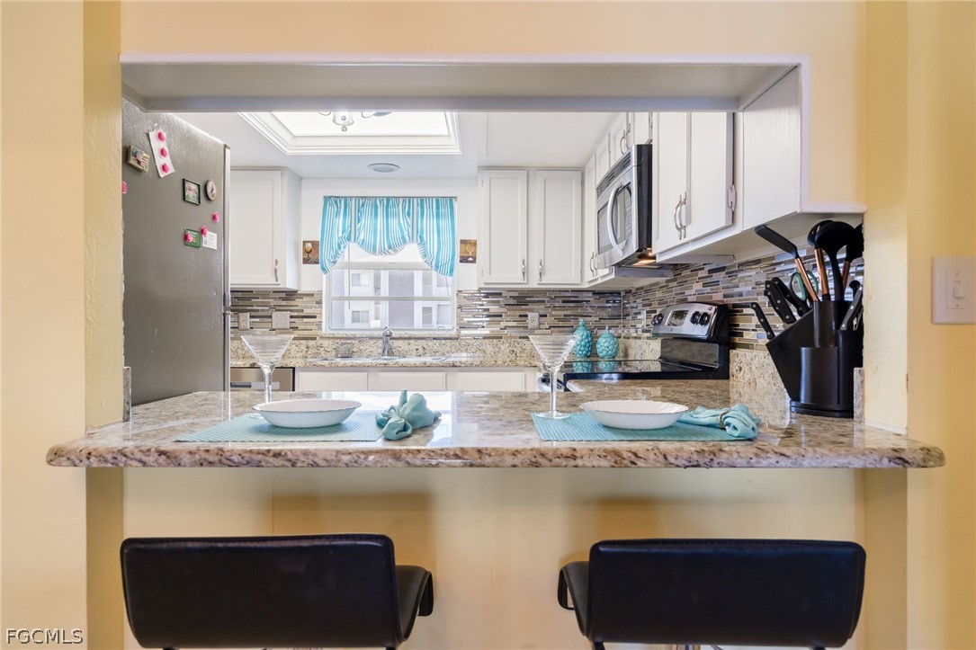 Turnkey furnished two story townhouse located in Royal Pelican on the south end of Fort Myers Beach. Light and bright interior with diagonal tile flooring in main living areas, well appointed kitchen with granite countertops and mosaic backsplash, and screened lanai overlooking the canal.