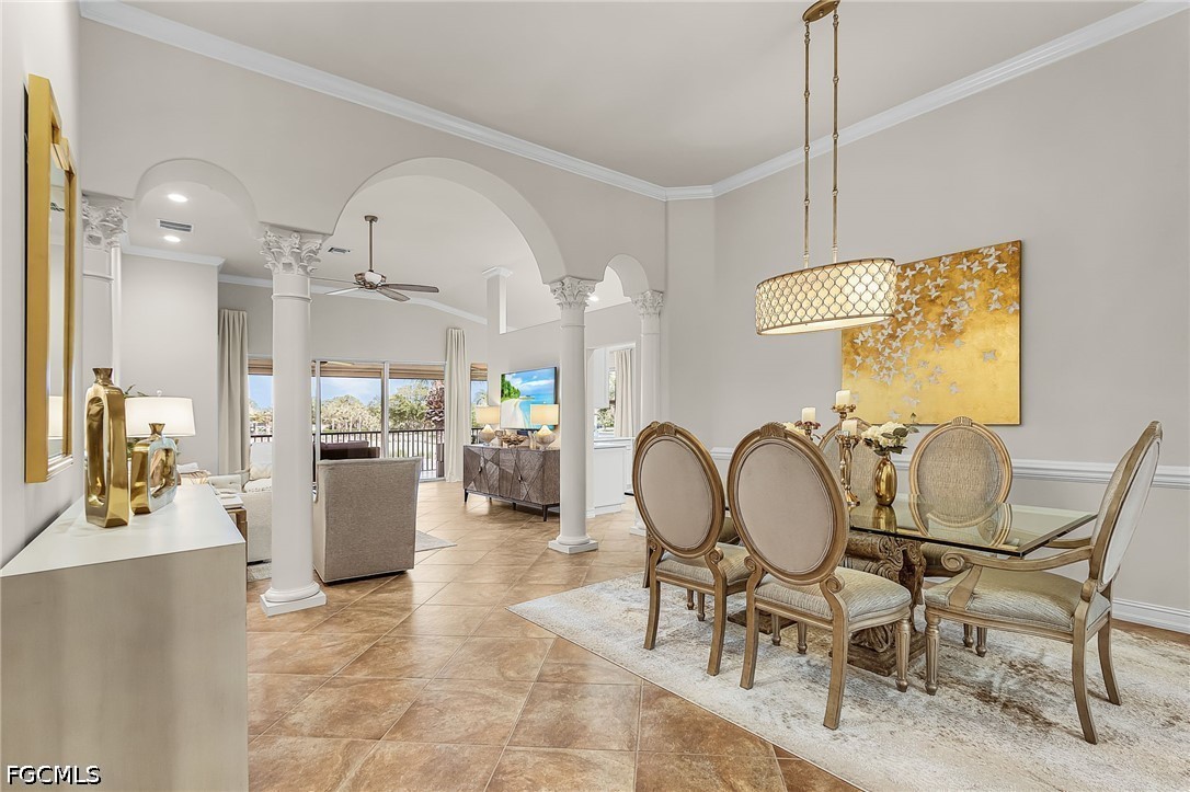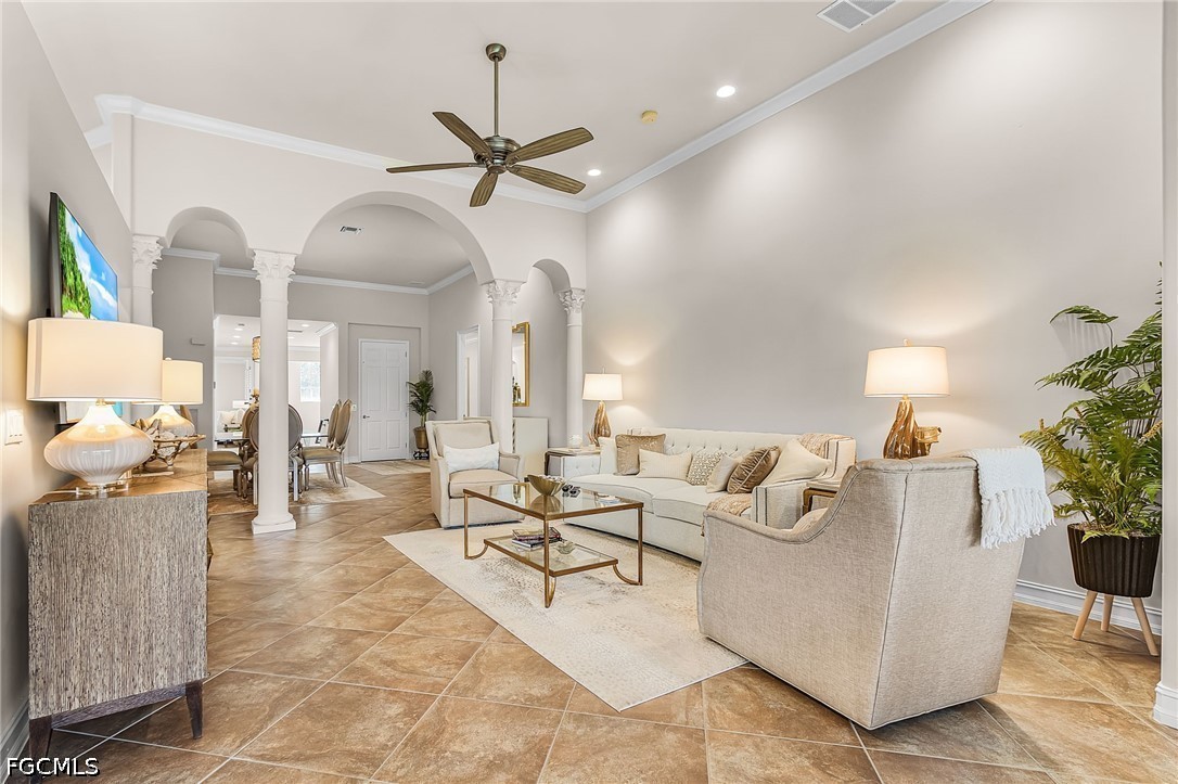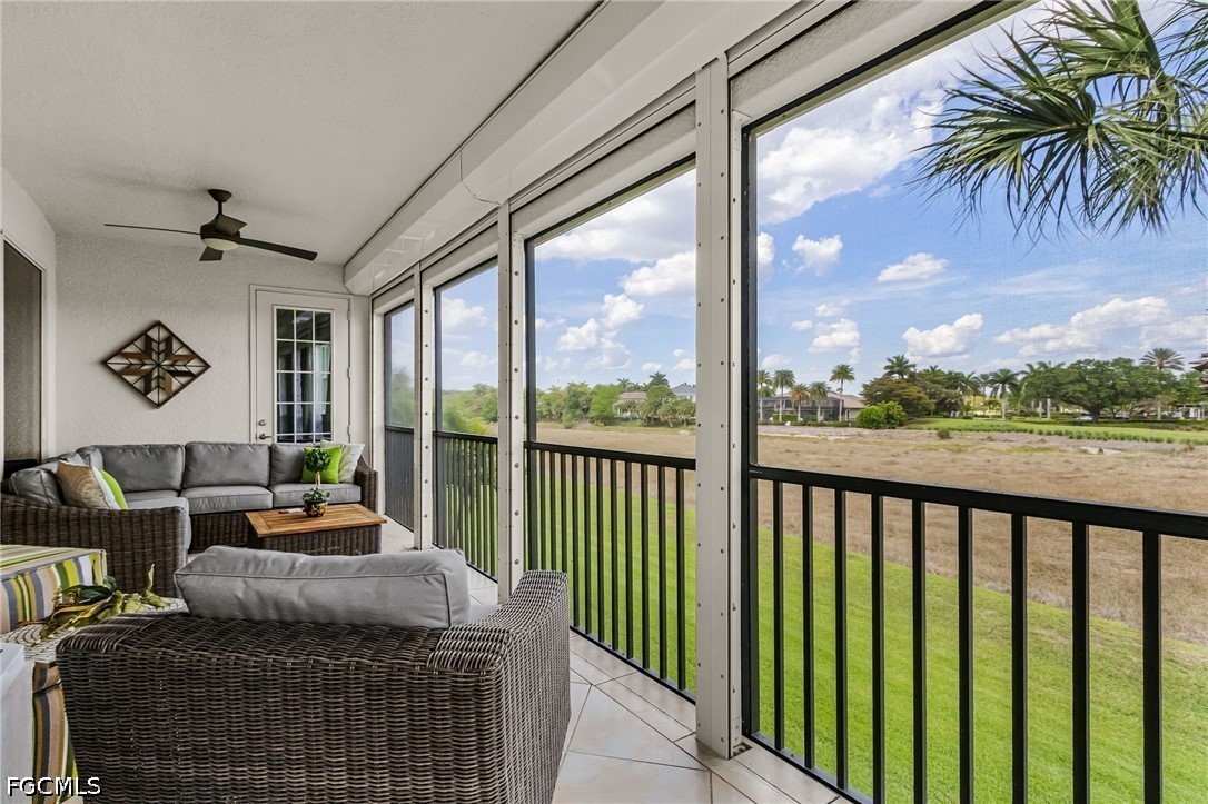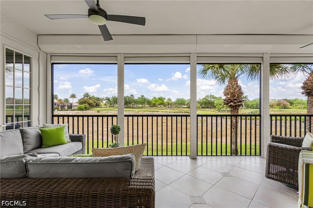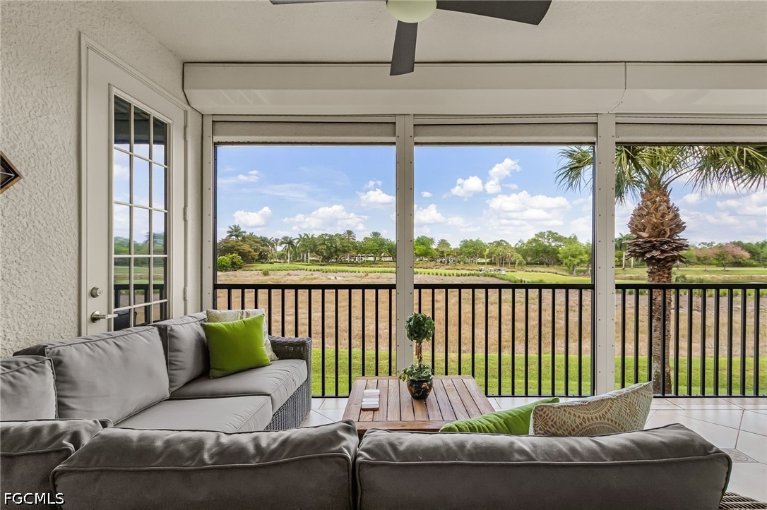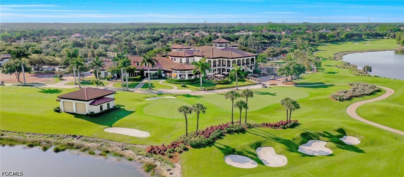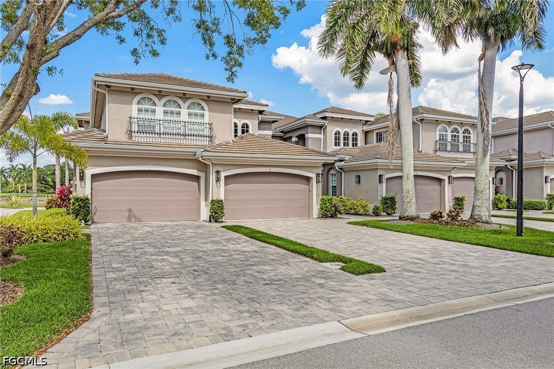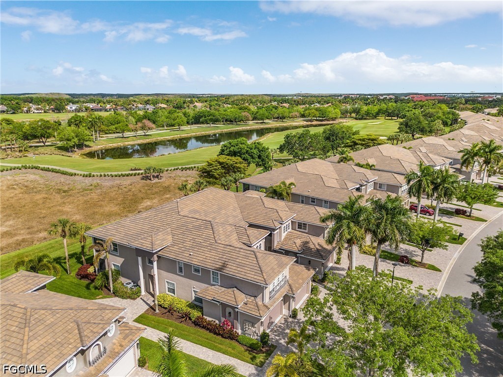 Beautifully renovated, turn-key furnished carriage home in the Triana neighborhood of The Club at Renaissance — one of South Fort Myers' most sought-after private golf communities. This exceptional second-floor residence offers 2,802 sq ft of refined living with golf course and lake views. The ground level features a private entry, two-car garage, and your choice of an elegant wrought iron staircase or private elevator to the main living floor. Upstairs, soaring ceilings and a dramatic arched colonnade with decorative columns define the open great room, which flows to the screened lanai overlooking the Arthur Hills championship course. The lanai is equipped with electric roll-down storm shutters for year-round convenience. The renovated kitchen features white raised-panel cabinetry with gold hardware, quartz countertops, geometric tile backsplash, under-cabinet lighting, stainless appliances, and a peninsula with bar seating. A breakfast nook with corner windows frames golf course views. The utility room offers a front-load washer and dryer, quartz countertops, utility sink, and ample cabinetry. The primary suite features a walk-in closet, tray ceiling, hardwood floors, and golf course views. The en-suite bath includes a double vanity with granite countertops, soaking tub, and walk-in glass shower. Two guest bedrooms offer tray ceilings, hardwood floors, and plantation shutters. The den is an ideal home office. The oversized media room features triple arched windows, plantation shutters, a built-in bar with wine cooler, and hardwood floors. The Club at Renaissance is a private, gated community on 500+ acres featuring an Arthur Hills championship golf course, resort-style pool and pavilion, full-service spa and fitness center, six red clay tennis courts, two pickleball courts, two bocce courts, and a children's play area. Year-round dining and social programming complete the lifestyle.