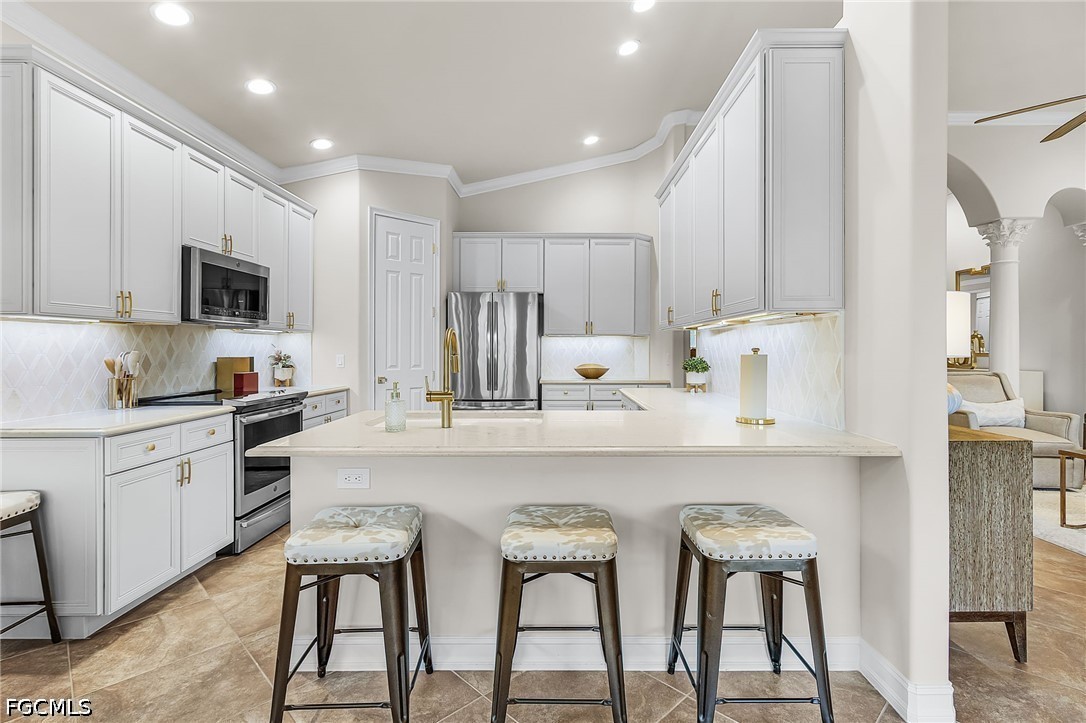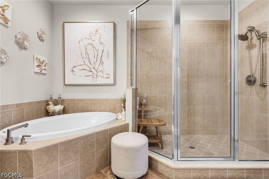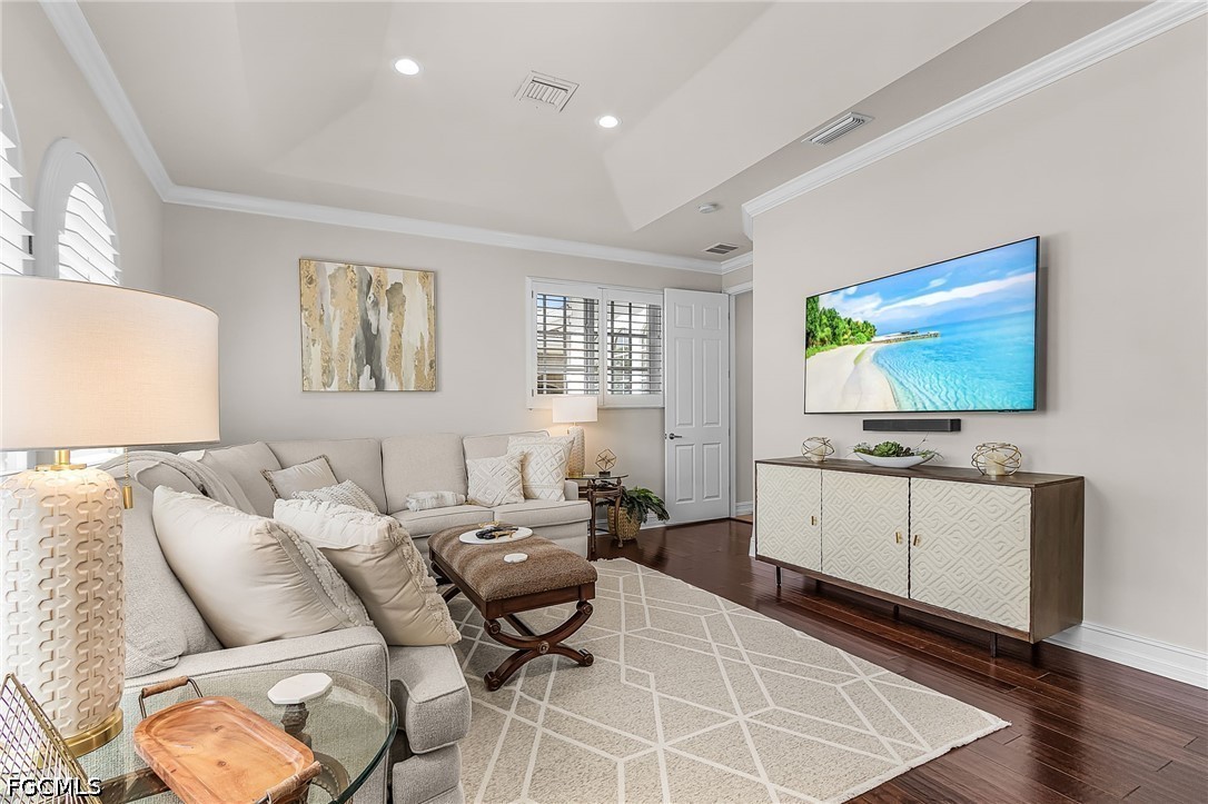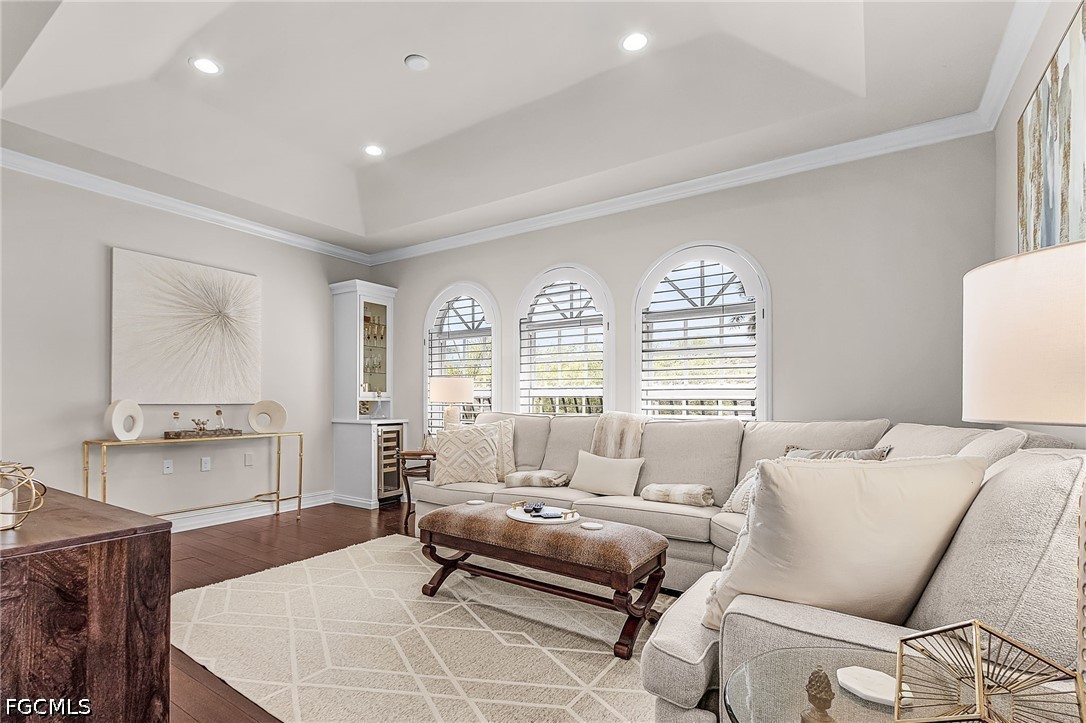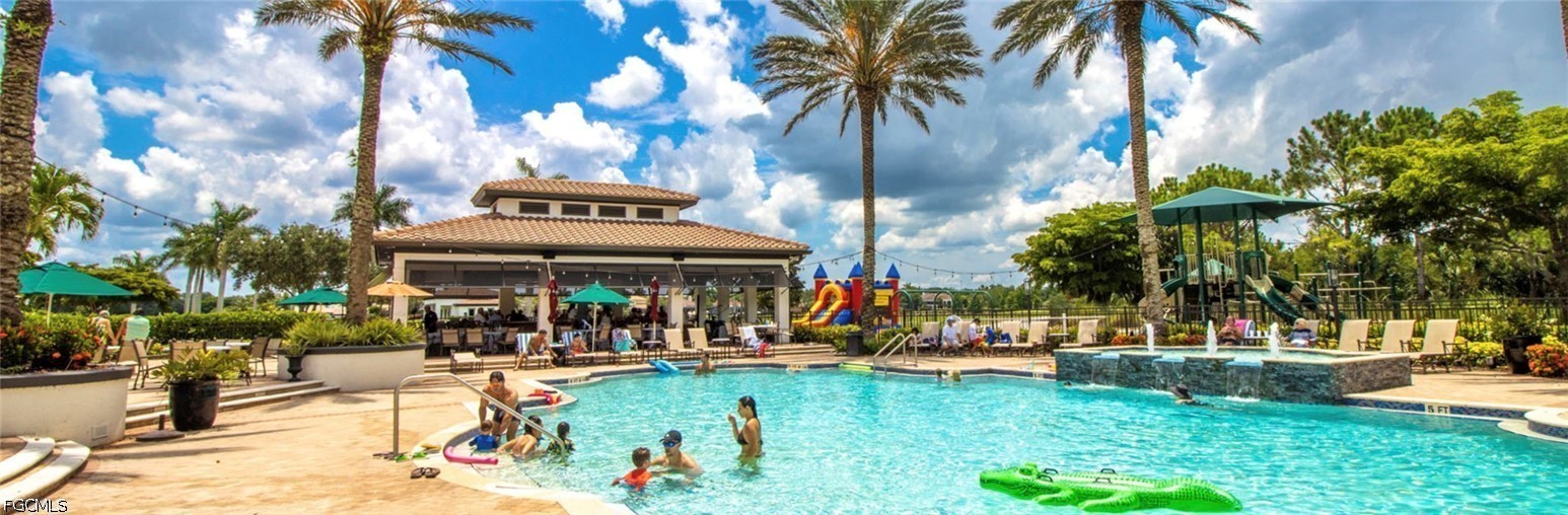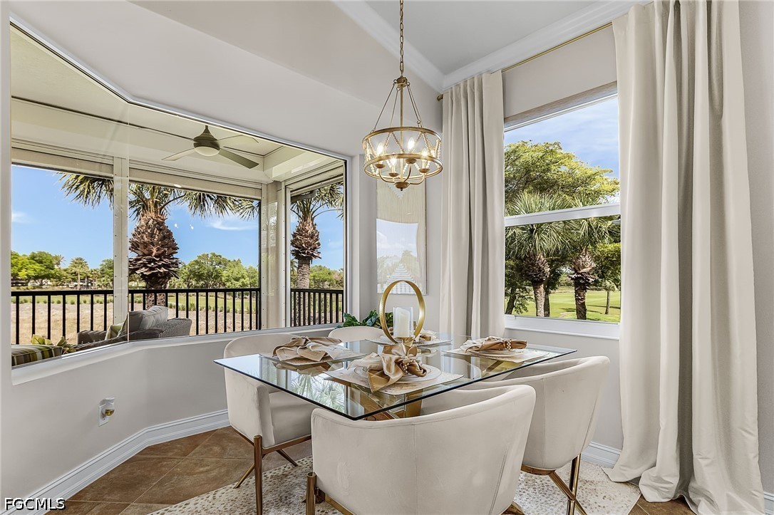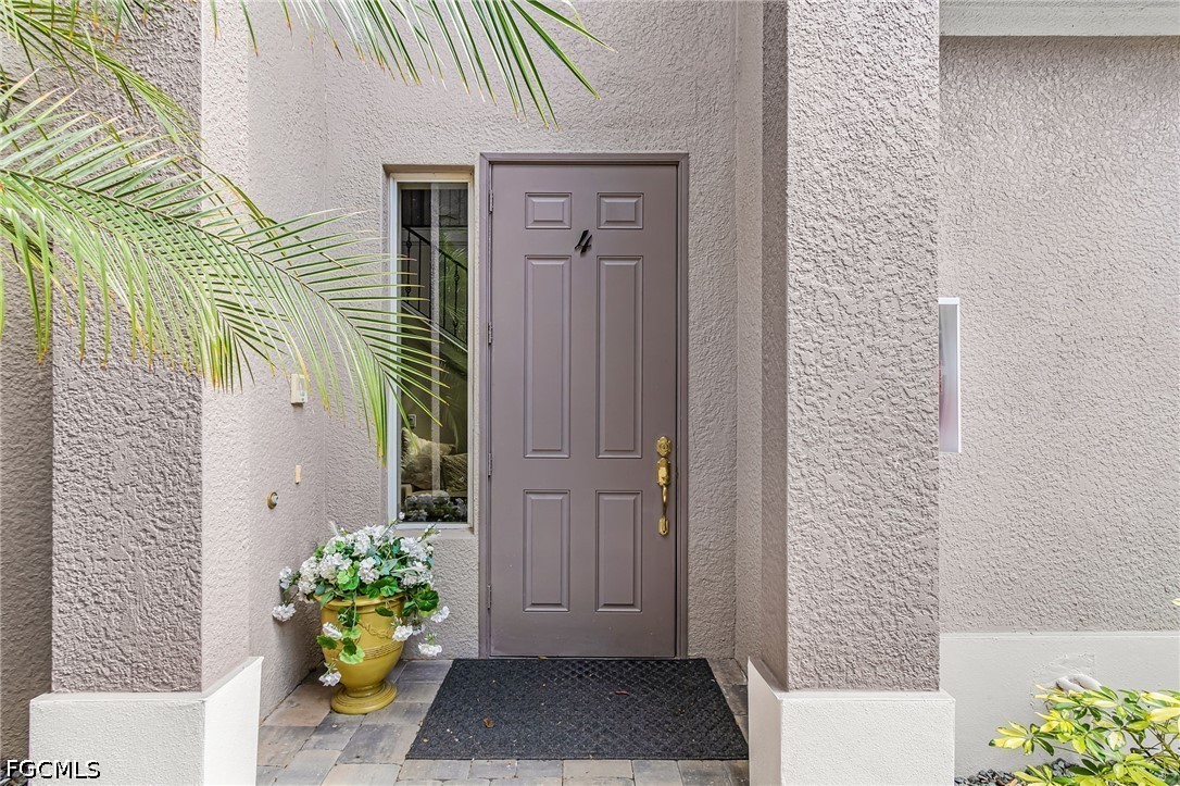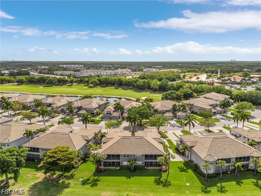 Beautifully renovated, turn-key furnished carriage home in the Triana neighborhood of The Club at Renaissance — one of South Fort Myers' most sought-after private golf communities. This exceptional second-floor residence offers 2,802 sq ft of refined living with golf course and lake views. The ground level features a private entry, two-car garage, and your choice of an elegant wrought iron staircase or private elevator to the main living floor. Upstairs, soaring ceilings and a dramatic arched colonnade with decorative columns define the open great room, which flows to the screened lanai overlooking the Arthur Hills championship course. The lanai is equipped with electric roll-down storm shutters for year-round convenience. The renovated kitchen features white raised-panel cabinetry with gold hardware, quartz countertops, geometric tile backsplash, under-cabinet lighting, stainless appliances, and a peninsula with bar seating. A breakfast nook with corner windows frames golf course views. The utility room offers a front-load washer and dryer, quartz countertops, utility sink, and ample cabinetry. The primary suite features a walk-in closet, tray ceiling, hardwood floors, and golf course views. The en-suite bath includes a double vanity with granite countertops, soaking tub, and walk-in glass shower. Two guest bedrooms offer tray ceilings, hardwood floors, and plantation shutters. The den is an ideal home office. The oversized media room features triple arched windows, plantation shutters, a built-in bar with wine cooler, and hardwood floors. The Club at Renaissance is a private, gated community on 500+ acres featuring an Arthur Hills championship golf course, resort-style pool and pavilion, full-service spa and fitness center, six red clay tennis courts, two pickleball courts, two bocce courts, and a children's play area. Year-round dining and social programming complete the lifestyle.