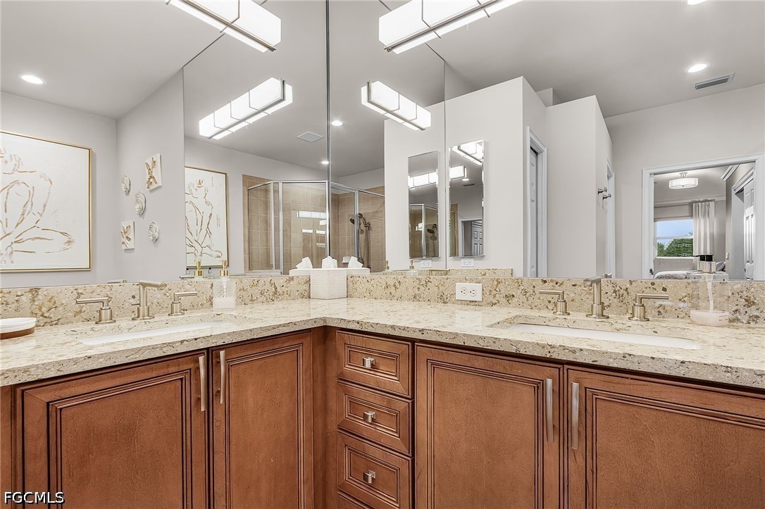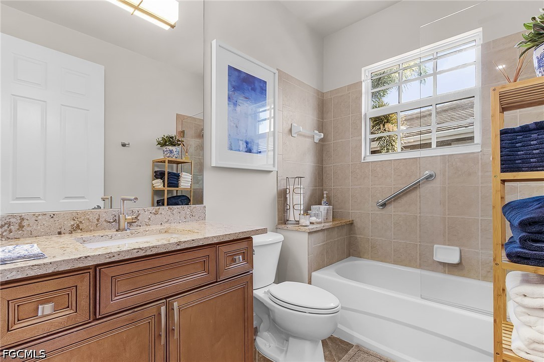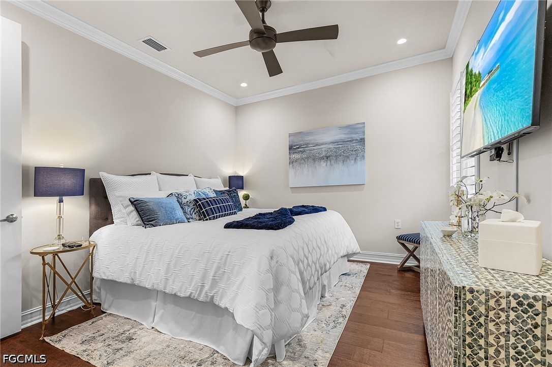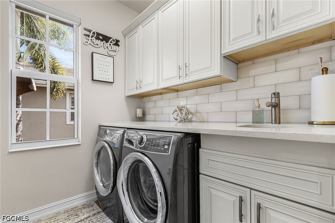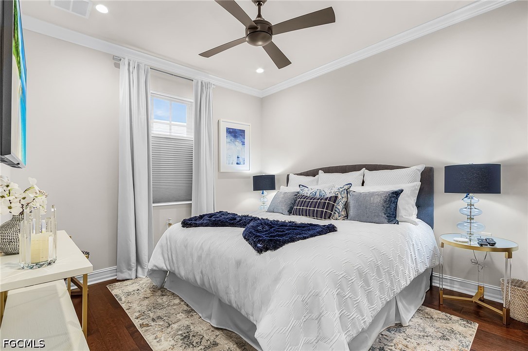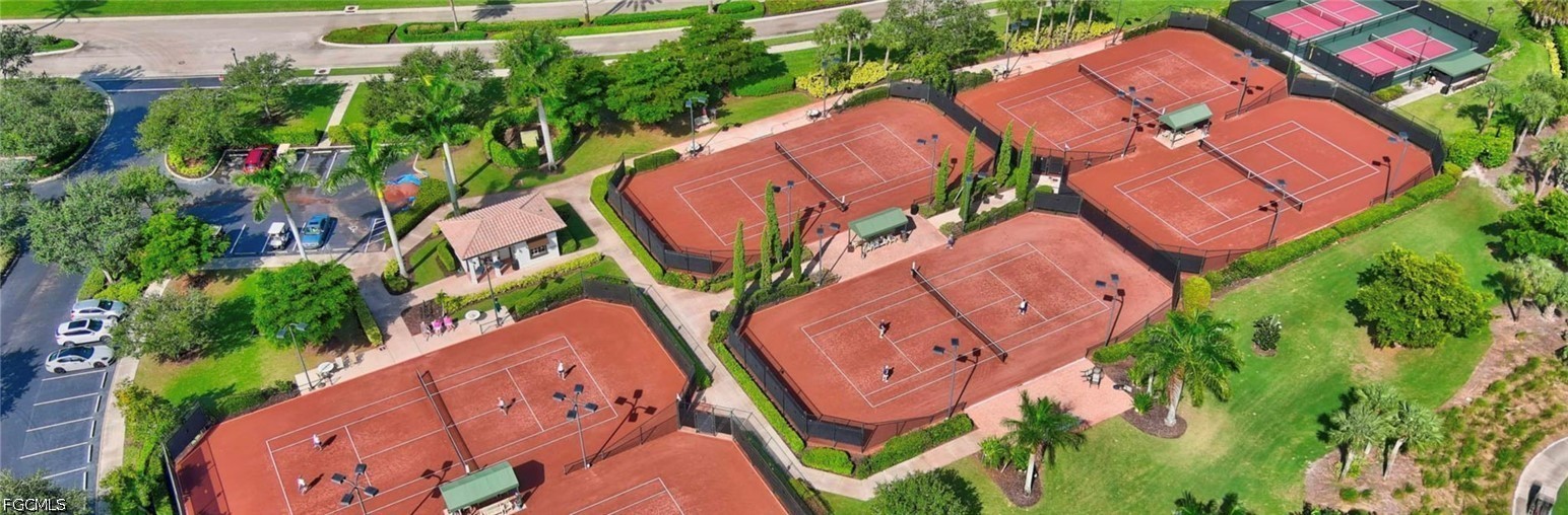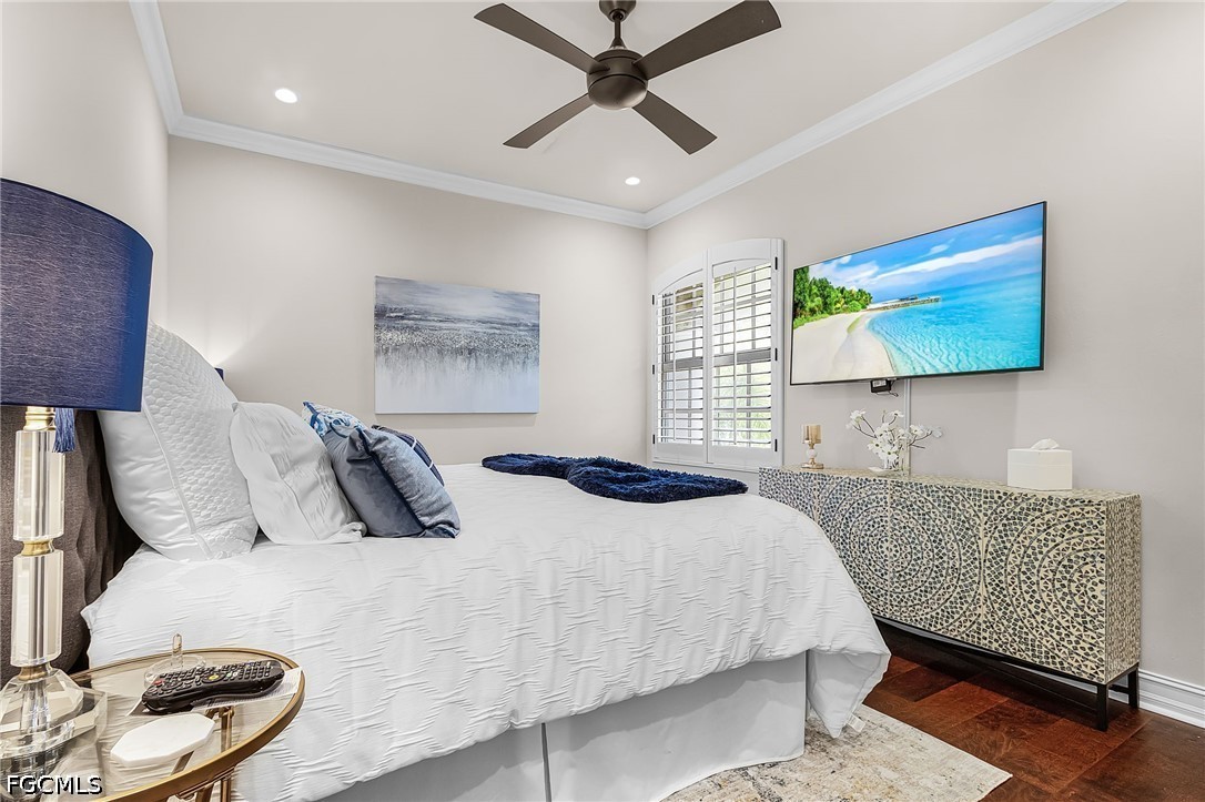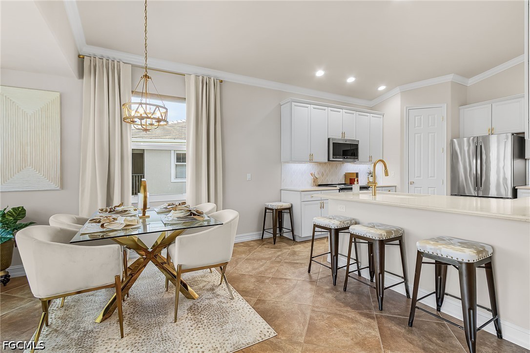 Beautifully renovated, turn-key furnished carriage home in the Triana neighborhood of The Club at Renaissance — one of South Fort Myers' most sought-after private golf communities. This exceptional second-floor residence offers 2,802 sq ft of refined living with golf course and lake views. The ground level features a private entry, two-car garage, and your choice of an elegant wrought iron staircase or private elevator to the main living floor. Upstairs, soaring ceilings and a dramatic arched colonnade with decorative columns define the open great room, which flows to the screened lanai overlooking the Arthur Hills championship course. The lanai is equipped with electric roll-down storm shutters for year-round convenience. The renovated kitchen features white raised-panel cabinetry with gold hardware, quartz countertops, geometric tile backsplash, under-cabinet lighting, stainless appliances, and a peninsula with bar seating. A breakfast nook with corner windows frames golf course views. The utility room offers a front-load washer and dryer, quartz countertops, utility sink, and ample cabinetry. The primary suite features a walk-in closet, tray ceiling, hardwood floors, and golf course views. The en-suite bath includes a double vanity with granite countertops, soaking tub, and walk-in glass shower. Two guest bedrooms offer tray ceilings, hardwood floors, and plantation shutters. The den is an ideal home office. The oversized media room features triple arched windows, plantation shutters, a built-in bar with wine cooler, and hardwood floors. The Club at Renaissance is a private, gated community on 500+ acres featuring an Arthur Hills championship golf course, resort-style pool and pavilion, full-service spa and fitness center, six red clay tennis courts, two pickleball courts, two bocce courts, and a children's play area. Year-round dining and social programming complete the lifestyle.