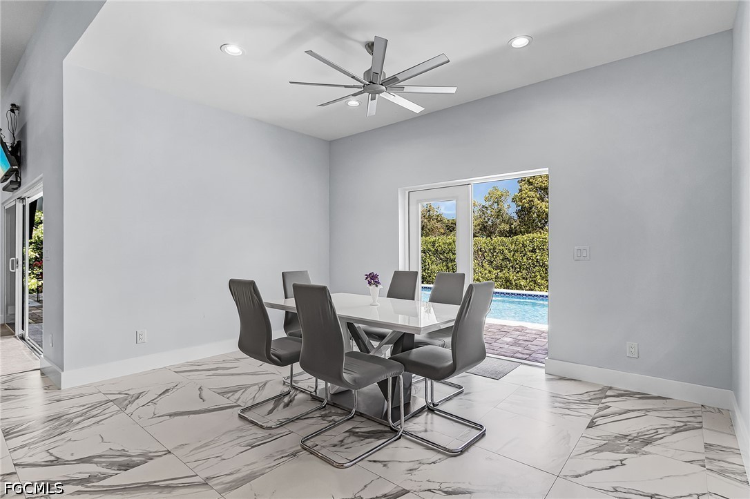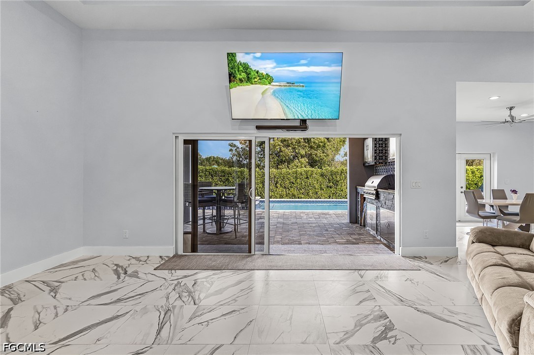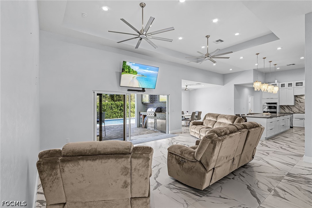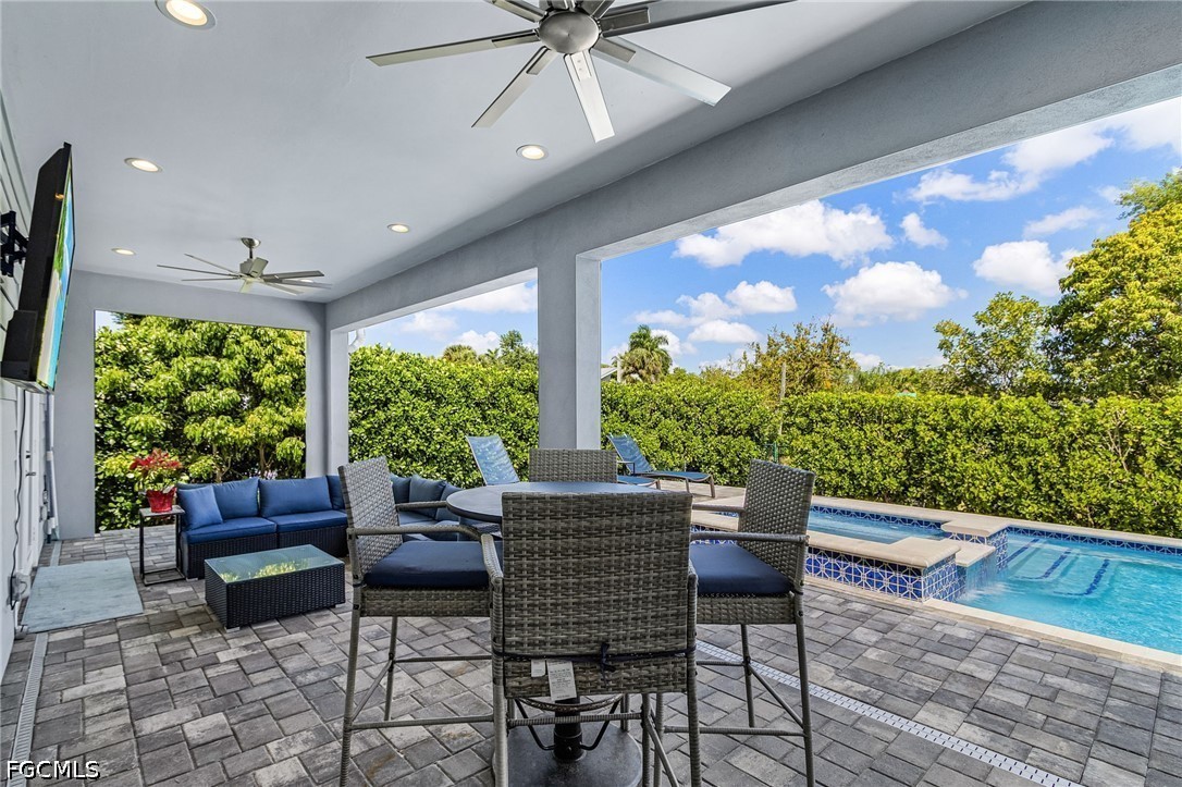 Set on a beautifully fenced 1/3-acre oversized lot, the outdoor living space is designed for relaxation and entertaining, featuring a spacious patio overlooking a resort-style saltwater pool and spa, along with expansive green space for pets or play.