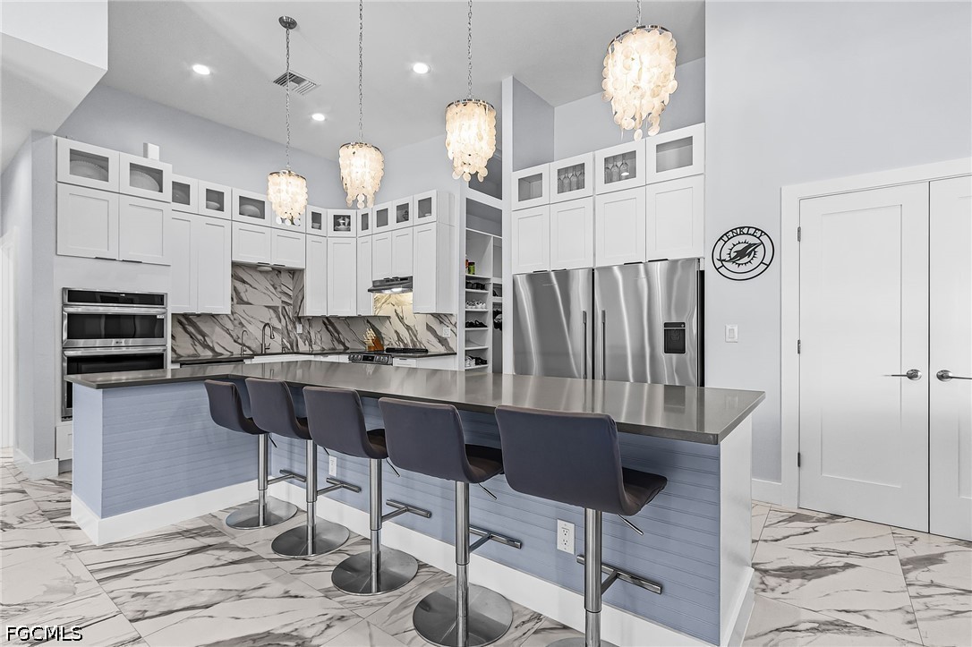At the heart of the home, the designer chef’s kitchen impresses with a twin refrigerator, range with oven, and a separate double wall oven—perfectly suited for elevated entertaining and everyday luxury.