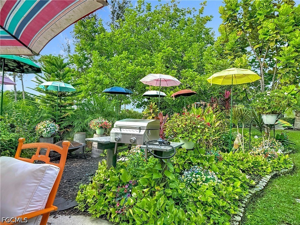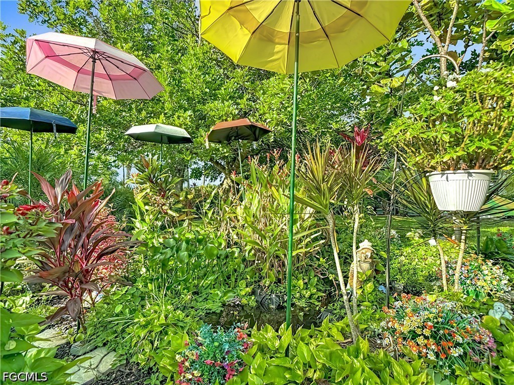 Enjoy your own private backyard oasis—a true sanctuary with a goldfish pond, cozy fireplace area, and lush landscaping perfect for relaxing or entertaining. The home also includes pull-down attic stairs in the garage and a golf cart (included) for easy community access.