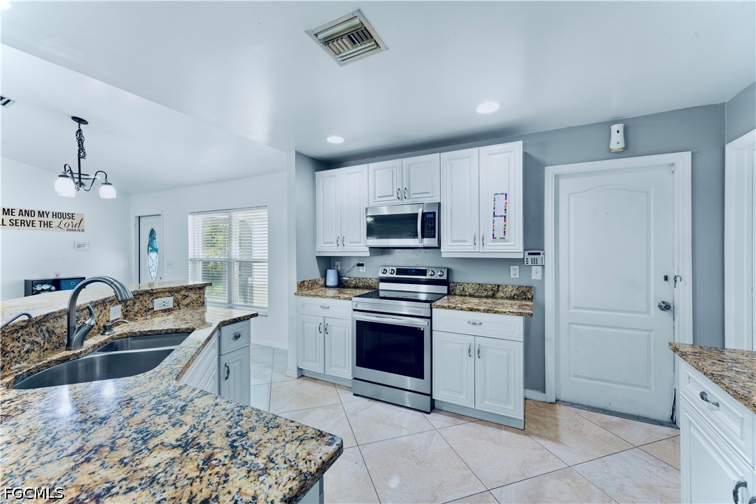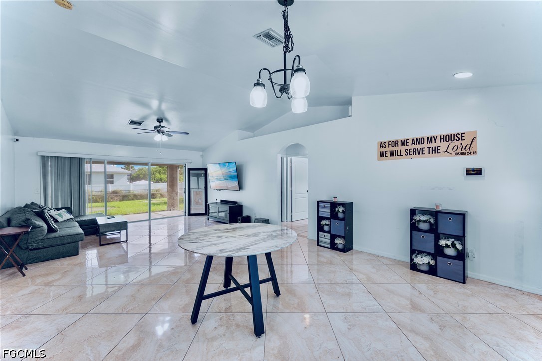 Welcome home to this meticulously maintained 3/2 freshly painted FENCED peaceful property nestled away on a quiet street in the highly desirable West side. It spotlights impressive porcelain tile flooring, an enticing tiled breakfast bar with GRANITE countertops & newer STAINLESS STEEL appliances, WALK IN closet, and a TILED front porch & screened back lanai great for entertaining. This split floor plan also highlights Cathedral ceilings, attractive decorative shutters, IMPACT windows, desirable HIGH speed internet, recessed lighting, pantry, window treatments, laundry room under air, and planet of room for a pool. It is just minutes from major amenities and a quick commute to Fort Myers. Schedule your showing today!