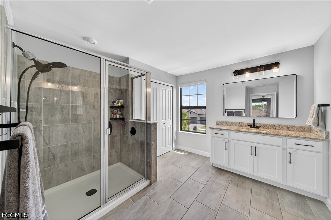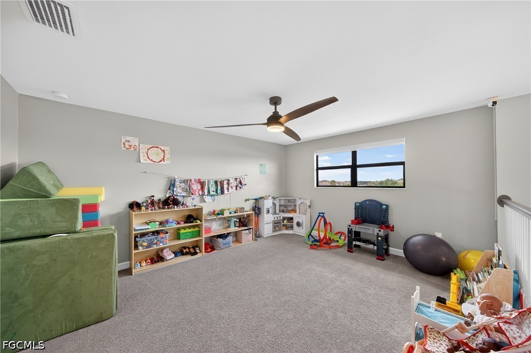 Upstairs, the layout continues to impress with a spacious loft and four additional bedrooms. The primary suite features dual walk-in closets with custom built-in systems and a beautifully appointed bathroom with separate vanities and a walk-in shower. This home is loaded with upgrades that matter: custom closet systems throughout, upgraded lighting, matte black fixtures and hardware, accent walls, additional blown-in insulation for efficiency, and power-operated smart blinds—including blackout shades in the bedrooms. Even the garage is dialed in with epoxy floors and overhead storage racks. And yes—the golf cart is included.