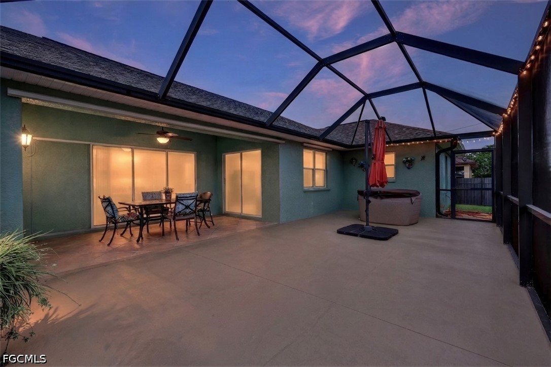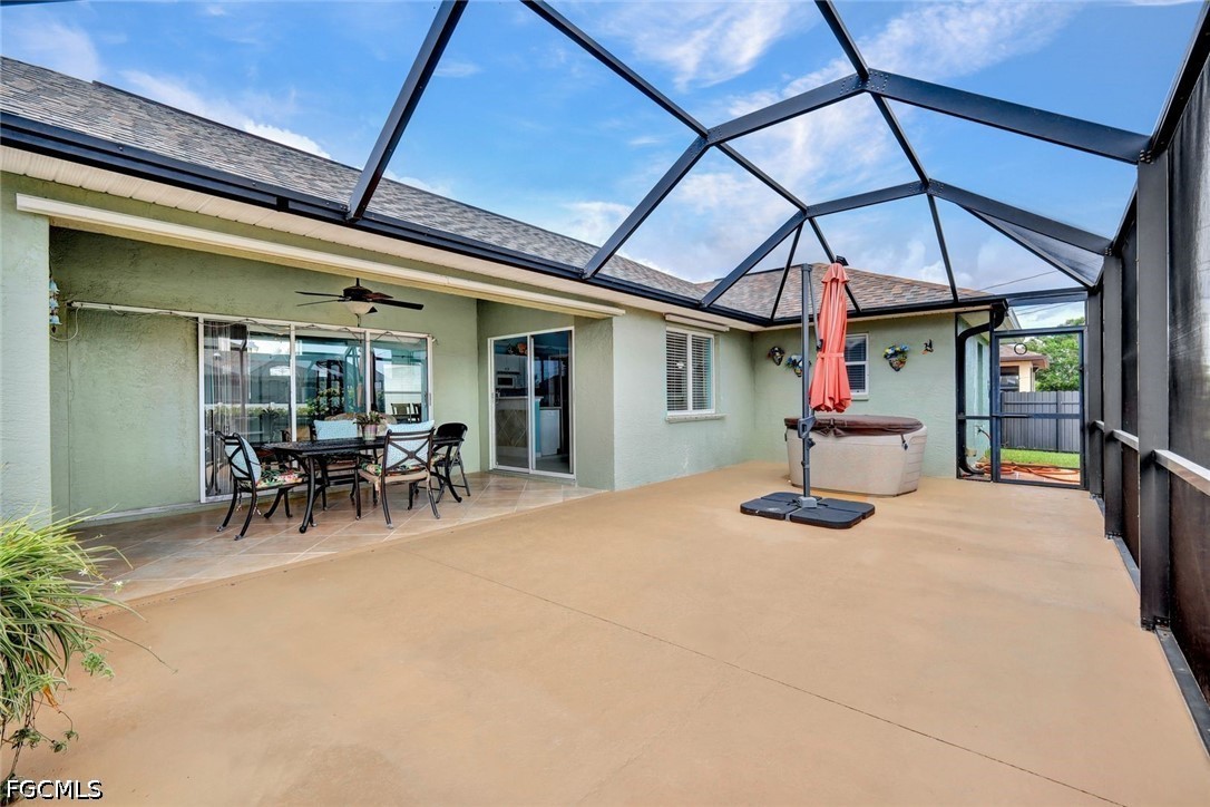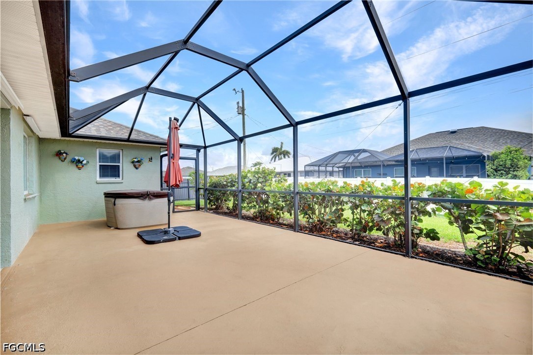 Welcome to this bright and beautifully maintained 3-bedroom, 2-bathroom home offering 1,589 square feet of comfortable Florida living on a desirable corner lot in sought-after Southwest Cape Coral. The open floor plan is filled with natural light and features a smart split-bedroom layout, perfect for both everyday living and entertaining. The lushly landscaped yard stays picture-perfect year-round thanks to a full irrigation system, adding stunning curb appeal with minimal effort. Step out back to your large screened lanai complete with a hot tub—the ultimate spot to unwind and enjoy those beautiful Southwest Florida evenings. The home is connected to city water and sewer, and sits in Flood Zone X, outside the Special Flood Hazard Area, for peace of mind. Located in one of Cape Coral's most desirable areas, you'll enjoy easy access to the waterfront dining, boutique shopping, and vibrant marina atmosphere at Cape Harbour and Tarpon Point Marina. Rotary Park Environmental Center, Sirenia Vista Park, and miles of walking and biking paths are just minutes away, along with a wide variety of restaurants, cafés, and retail along the Pine Island Road corridor and Cape Coral Parkway. Fort Myers Beach, Sanibel Island, and Southwest Florida International Airport are all within about a 35-minute drive. This is Southwest Cape Coral living at its finest—schedule your private showing today!