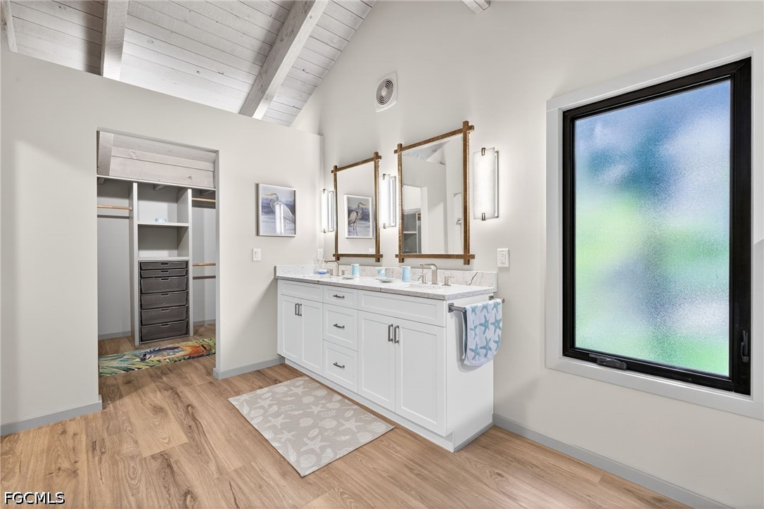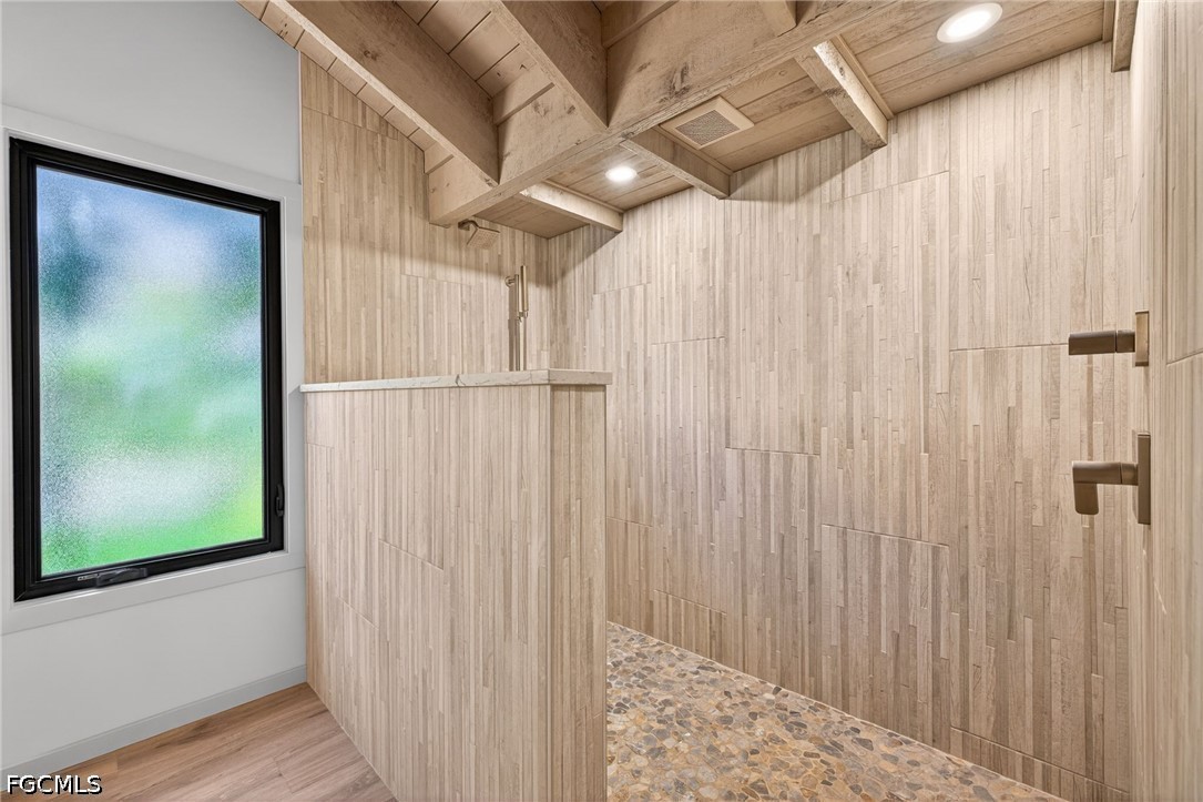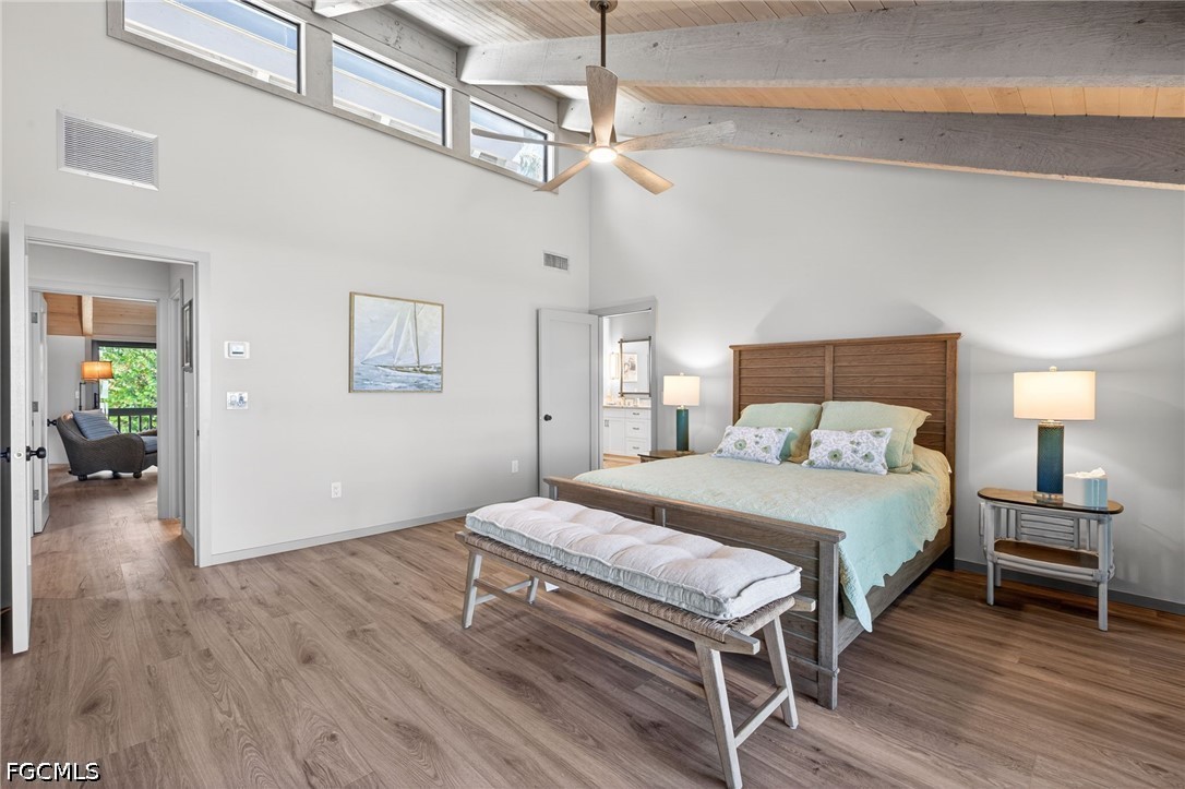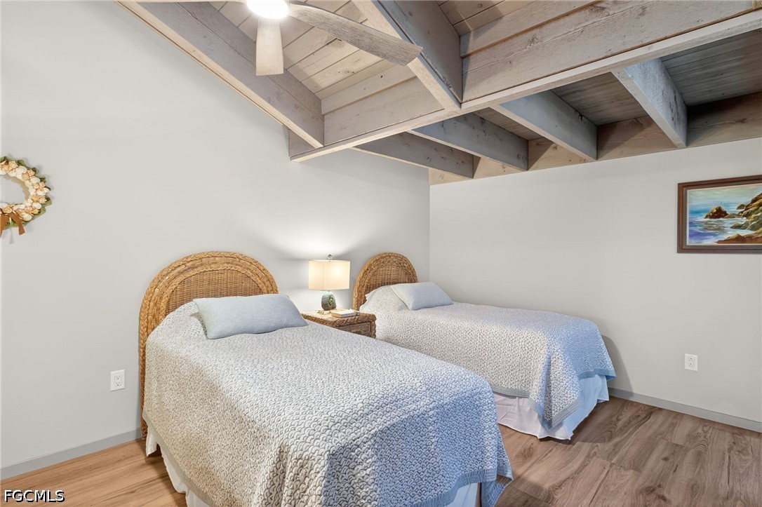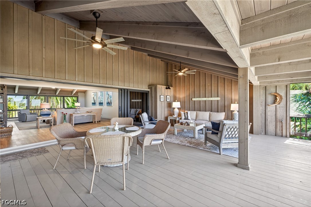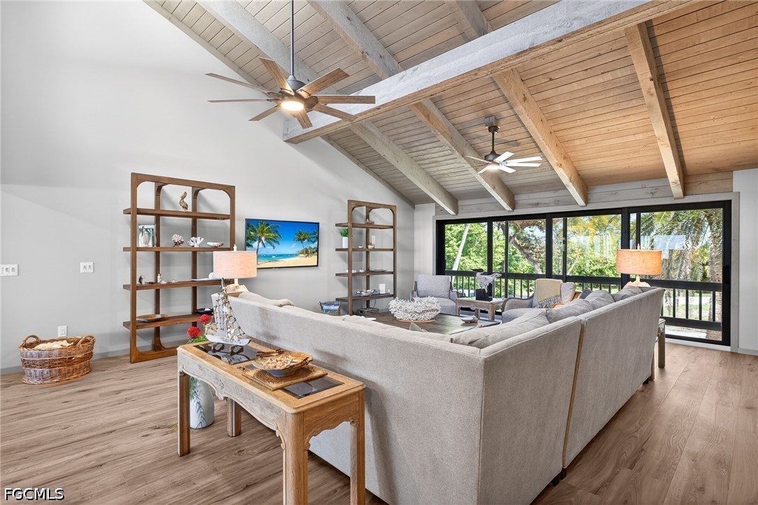 Inside, vaulted tongue-and-groove ceilings with exposed beams create warmth and architectural character, complemented by a calm, neutral palette, elegant, tiled baths, and a well-appointed kitchen with granite surfaces and premium appliances. Karastan luxury vinyl plank flooring runs throughout the home, while the lanai and surrounding balconies feature rich cedar decking echoed by the home’s classic cedar board-and-batten exterior.