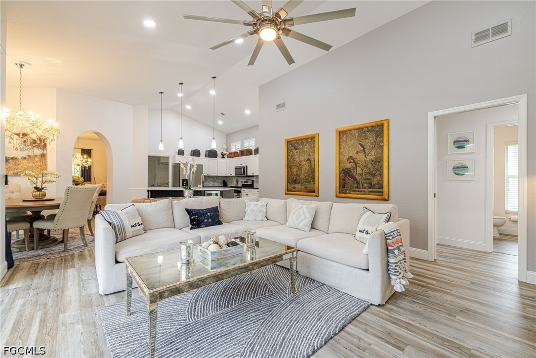 From the moment you walk in, you’re greeted with stunning pool views and a light, airy layout designed for both relaxing and entertaining. The home features formal living and dining spaces, along with a bright open-concept great room highlighted by soaring vaulted ceilings, recessed lighting, ceiling fans, and automated blinds for effortless comfort.