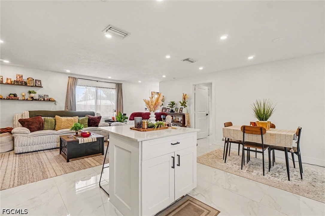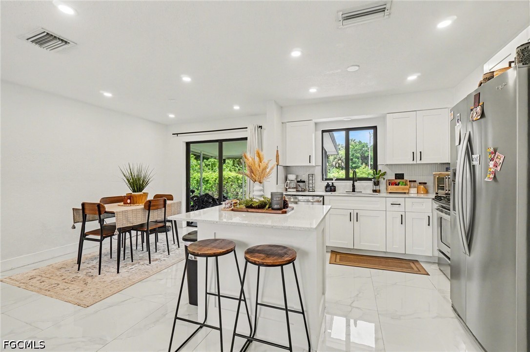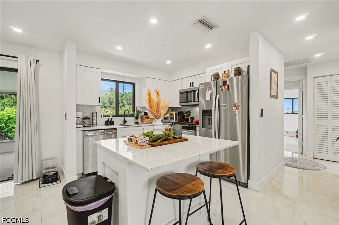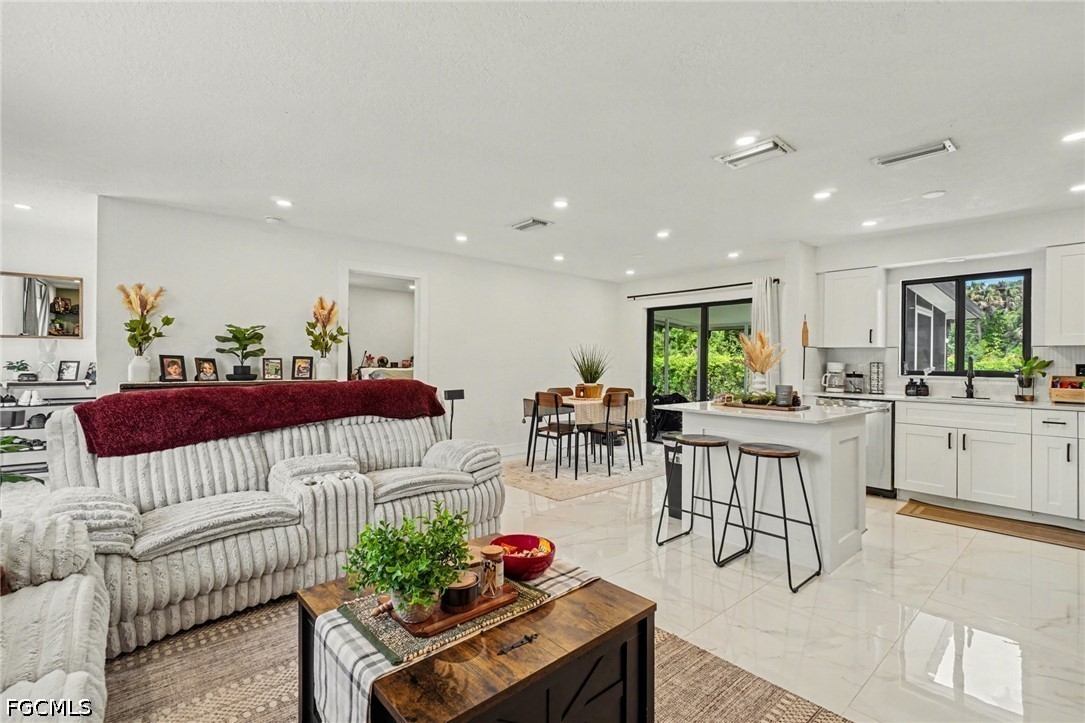 Just What you have been waiting for, a 4-bedroom waterfront home with direct Gulf access, ideally located on a canal just minutes to the Caloosahatchee River. Offering the true Southwest Florida boating lifestyle, you’ll enjoy quick, easy access to open water right from your backyard—with the option to add your own private dock. From the moment you arrive, the modern curb appeal stands out with a newly paved driveway and fresh, clean exterior accented in crisp black and white. Inside, the home features a bright, spacious open-concept layout designed for both everyday living and entertaining. The updated kitchen is the heart of the home, complete with a large island, white cabinetry, stylish backsplash, and brand-new stainless steel appliances. Throughout the home, you'll find sleek, marble-look tile flooring that enhances the light and airy feel. The spacious primary suite offers a private retreat with an ensuite bathroom and walk-in closet, while the additional bedrooms provide flexibility for guests, family, an office, or even a potential in-law setup. Both bathrooms have been thoughtfully updated with modern finishes to match the home’s contemporary design. An oversized laundry room with new washer and dryer adds convenience, along with extra storage space. Step outside to your screened lanai —perfect for relaxing, entertaining, and enjoying Florida’s year-round sunshine. The fully fenced backyard creates a private setting ideal for gatherings, pets, or simply unwinding by the water. Located in North Fort Myers, you're just a short drive to the Downtown Fort Myers River District, where you can enjoy waterfront dining, live entertainment, festivals, and more.
