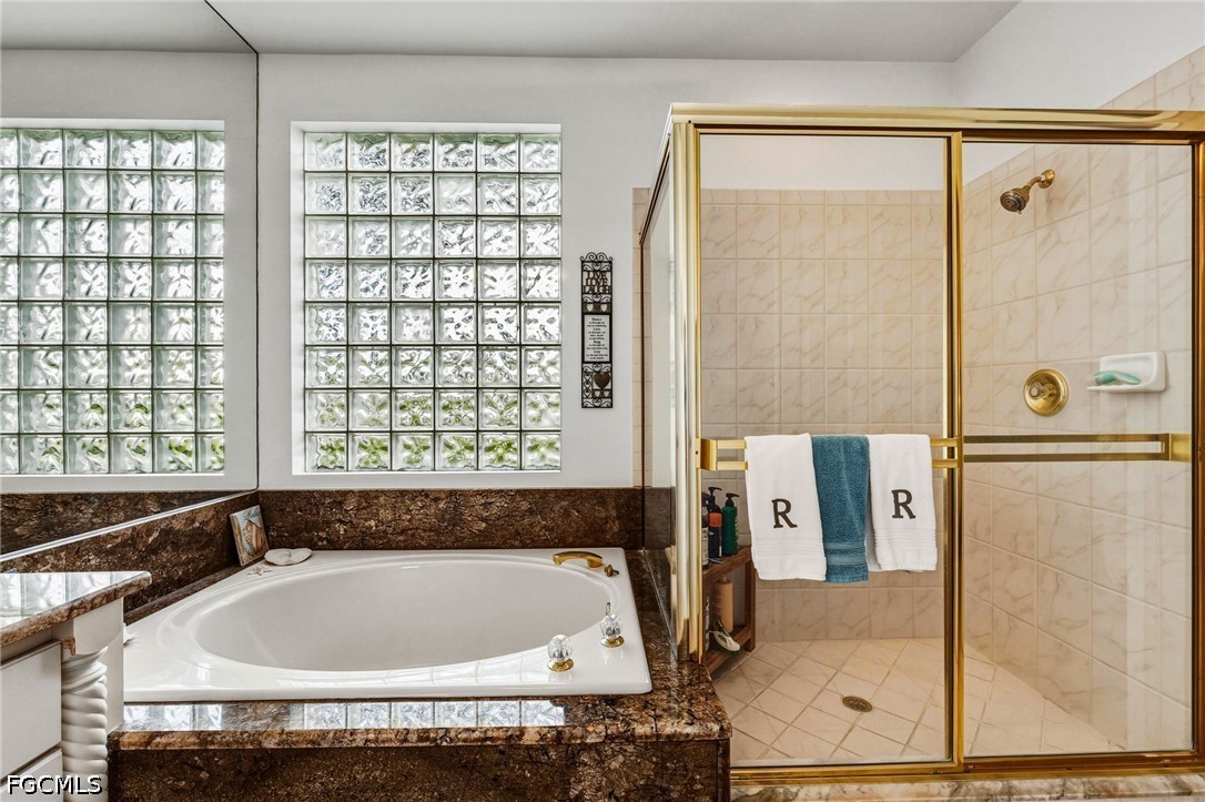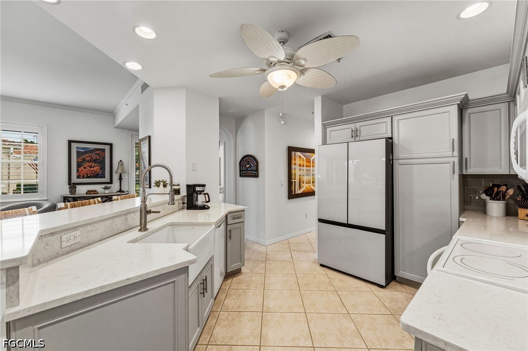 Inside, tile flooring extends throughout the light-filled living spaces, enhancing the home’s airy, refined ambiance. The thoughtfully updated kitchen is both stylish and functional, featuring quartz countertops, a farmhouse sink, new light gray cabinetry with soft-close doors and drawers, pull-out pantry shelving, a breakfast bar, a wine cooler, and a full suite of white appliances. Additional upgrades include a new refrigerator, tankless water softener, and a 2022 A/C system, while plantation shutters throughout add a timeless, upscale touch.
