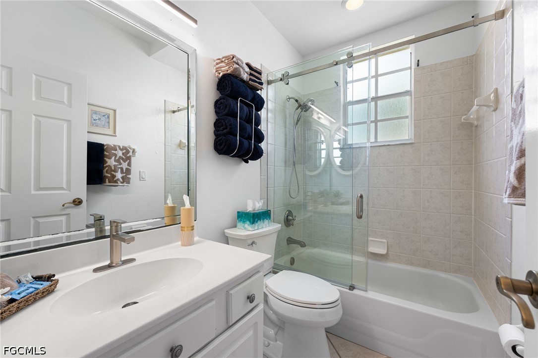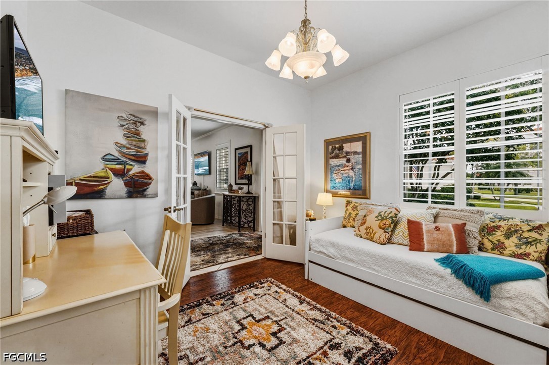 The spacious primary suite serves as a private retreat, complete with a well-appointed en-suite bath. A bright and inviting guest bedroom offers comfort and privacy, while the second full bath is enhanced by a seamless glass enclosure with a chic barn door design. The versatile third bedroom, featuring glass-paneled French doors, is ideal as a den, office, or additional guest accommodations.