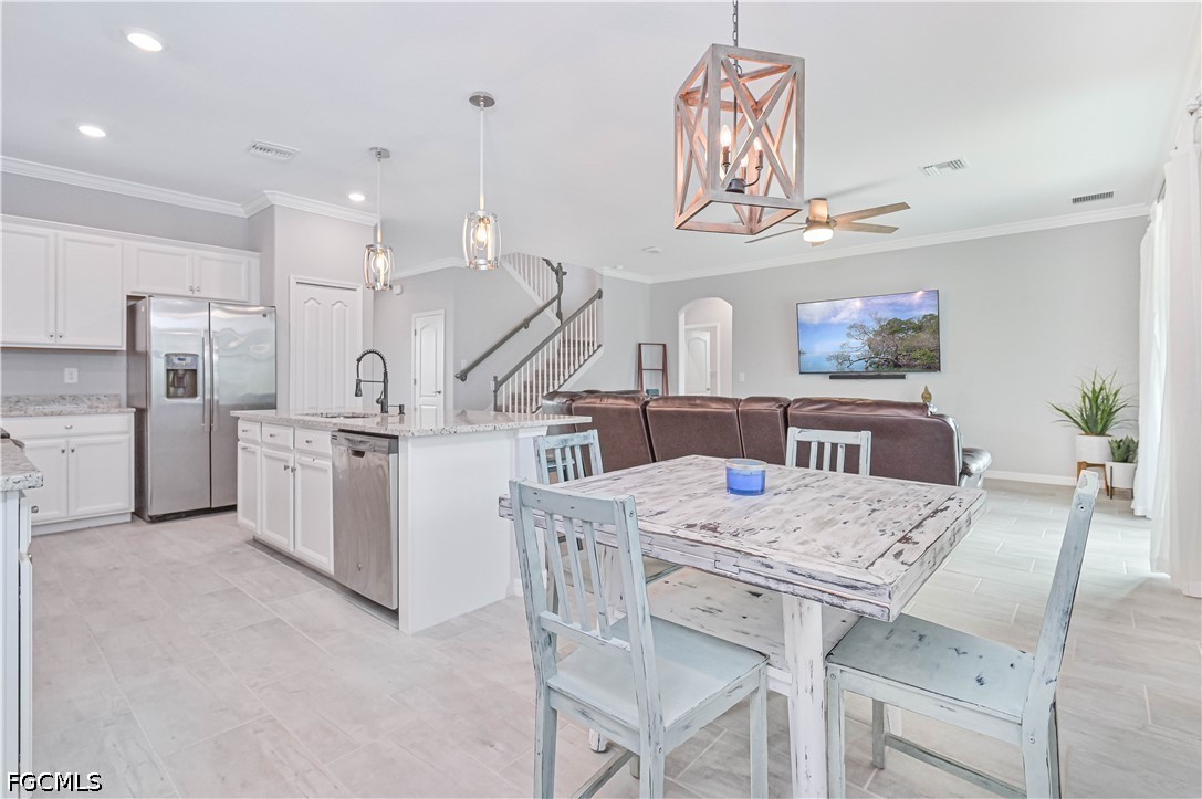 Inside, the thoughtfully designed floor plan offers both comfort and flexibility. The first floor features a guest bedroom and full bath, ideal for visitors or multi-generational living, along with a private den perfect for a home office or hobby space. The bright, open-concept kitchen showcases white shaker cabinetry, stainless steel appliances, granite countertops, and abundant storage, flowing seamlessly into the main living areas.