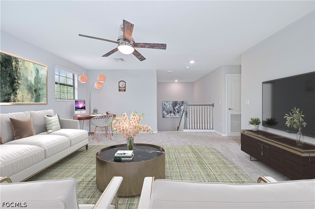 Upstairs, the spacious primary suite includes a large walk-in closet, accompanied by two additional bedrooms and a full bath. A generous loft provides the perfect bonus space for a second living area, playroom, or media room. Fresh new carpet upstairs enhances comfort and move-in readiness.