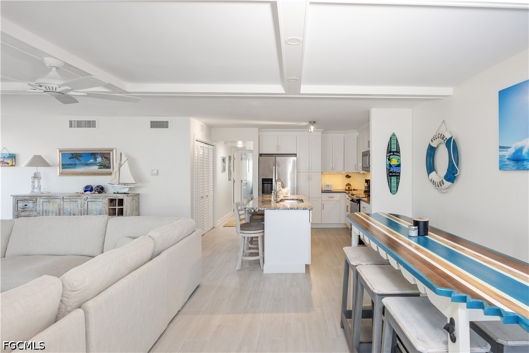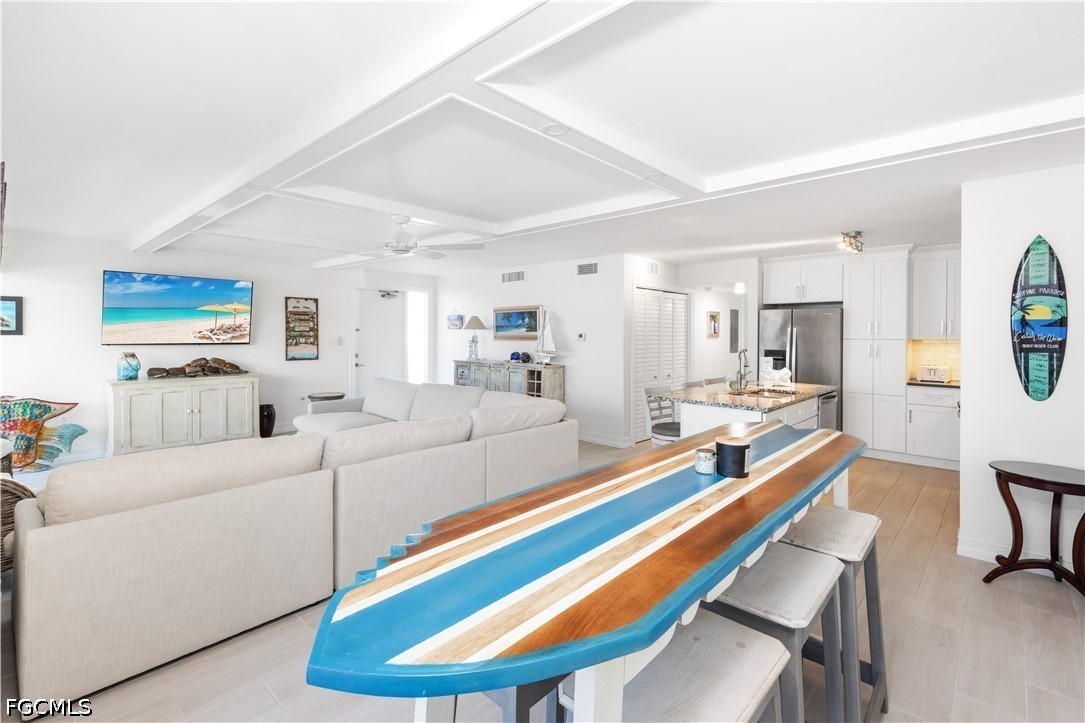 Enjoy the best of island living at Sunset South, a sought-after Gulf-front community located along beautiful Middle Gulf Drive on Sanibel Island. This spacious and beautifully updated residence offers approximately 1,460 square feet of light-filled living space, perfectly designed for a relaxing coastal getaway. Step inside to an open and inviting floor plan featuring bright interiors, expansive windows, and a seamless flow from living to dining—ideal for entertaining or unwinding after a day at the beach. The updated kitchen is well-appointed with stone countertops, custom cabinetry, and modern appliances, making it as functional as it is stylish. The primary suite provides a peaceful retreat, while the guest bedroom offers comfort and privacy for visitors. Additional features include a private garage, generous storage, and in-building laundry—making extended stays easy and convenient. Positioned within a low-density, Gulf-front community, Sunset South offers a quiet, residential feel with tropical landscaping, open green space, and a community pool. Enjoy easy access to Sanibel’s world-renowned shelling beaches just steps away, along with miles of bike paths, nearby dining, and island amenities. Whether you’re seeking a seasonal retreat or a longer-term island escape, this residence offers the perfect blend of comfort, location, and laid-back luxury.