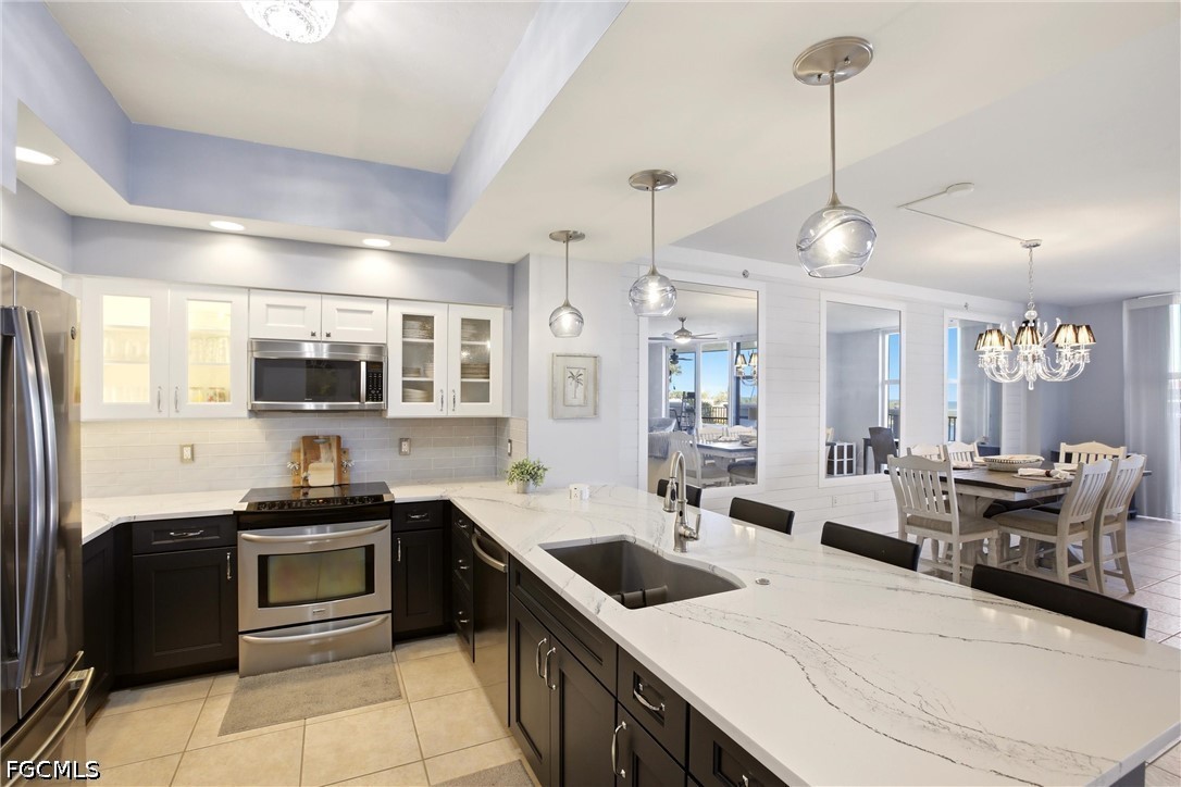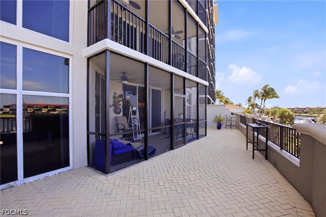 Welcome to waterfront living in Grande Isle Towers. This beautifully maintained, turnkey 3-bedroom, 3-bath residence designed to capture sweeping views of Charlotte Harbor. Perfectly positioned on the first floor, this exceptional residence features both a screened lanai and an expansive open-air balcony. Inside, the home opens to a bright and spacious open-concept living, dining, and kitchen area. The kitchen is highlighted with elegant quartz countertops and matching white subway tile backsplash. The large island offers generous prep space and casual seating. It is well-appointed with stainless steel appliances, including a built-in microwave and range. Two-tone cabinetry enhances the design, pairing white upper cabinets—some with glass-front displays—with darker lower cabinetry for added depth, style, and storage. The dining and living areas flow seamlessly from the kitchen, creating a cohesive, airy layout ideal for both relaxing and entertaining. A convenient wet bar with a built-in wine cooler enhances the space, making it perfect for hosting and everyday enjoyment. Neutral tile flooring runs throughout, complemented by soft coastal tones that reinforce the relaxed waterfront ambiance. Large sliding glass doors fill the living area with natural light and open to the lanai and balcony, extending the living space outdoors. The spacious primary suite features direct access to the lanai, stunning water views, oversized walk-in closets, and a luxurious ensuite bath complete with a soaking tub, dual sinks, and a walk-in shower. Guests will appreciate the desirable split-bedroom layout, which includes two additional bedrooms—one of which is ensuite for added privacy. Peace of mind is ensured with impact-resistant hurricane windows and sliders, along with a prime location in Flood Zone X due to the building’s elevated position within the marina. Additional upgrades include plantation shutters, custom blinds, coastal furnishings and décor, French doors, a new dishwasher, assigned under-building parking, and an indoor laundry room with cabinetry and sink. The gated under-building garage offers kayak, golf cart, and bicycle storage, along with a private storage closet for all your beach, golf, and boating essentials. Residents of Grande Isle enjoy access to an exceptional clubhouse featuring an Olympic-size heated pool and spa, grilling area, elegant social room with catering kitchen, bar & billiards, fitness center, private theater, steam room, and dry sauna. Burnt Store Marina offers an unmatched waterfront lifestyle, anchored by the largest deep-water marina in Southwest Florida with boat storage, slips, and ramp access. Additional amenities include 3 on-site restaurants with live music & events, yacht & country clubs, social & fishing clubs, Freedom Boat Club, bocce, tennis and pickleball courts, a second fitness center, and a 27-hole executive golf course. **PLEASE ENJOY THE 3D INTERACTIVE VIRTUAL TOUR ASSOCIATED WITH THIS LISTING**