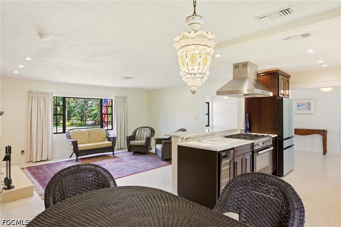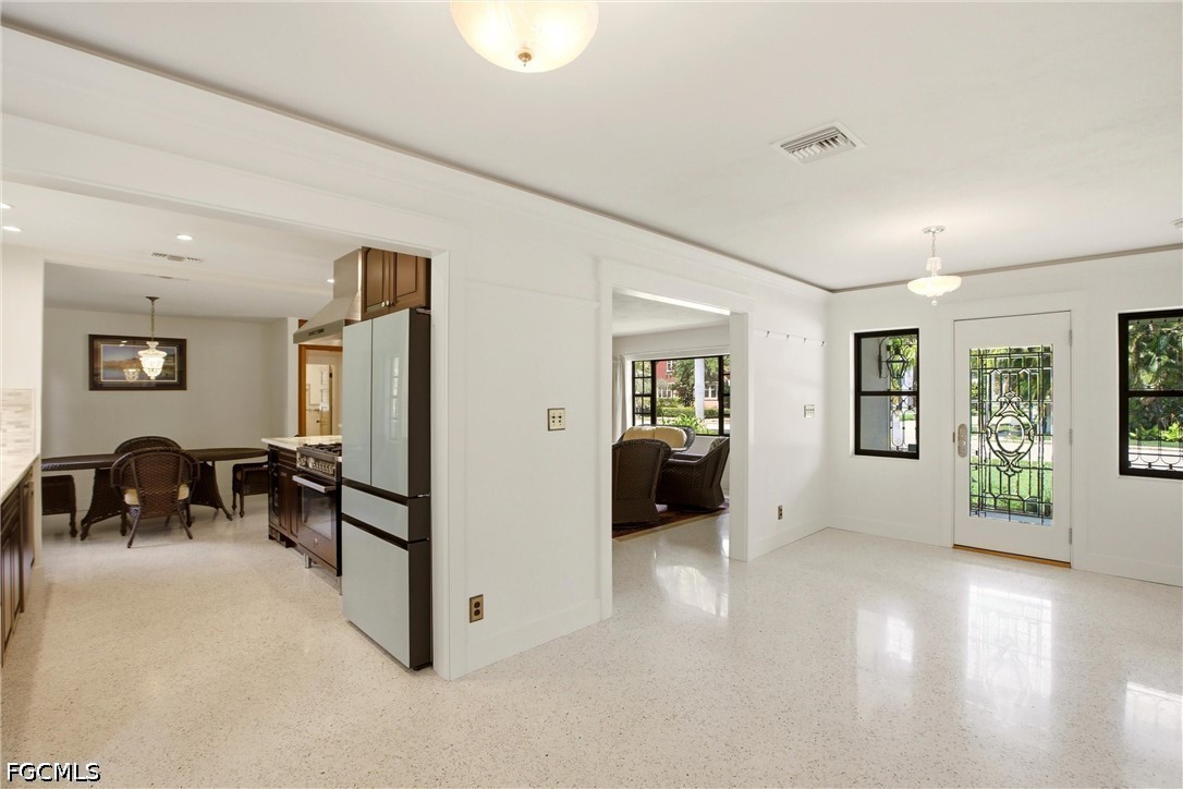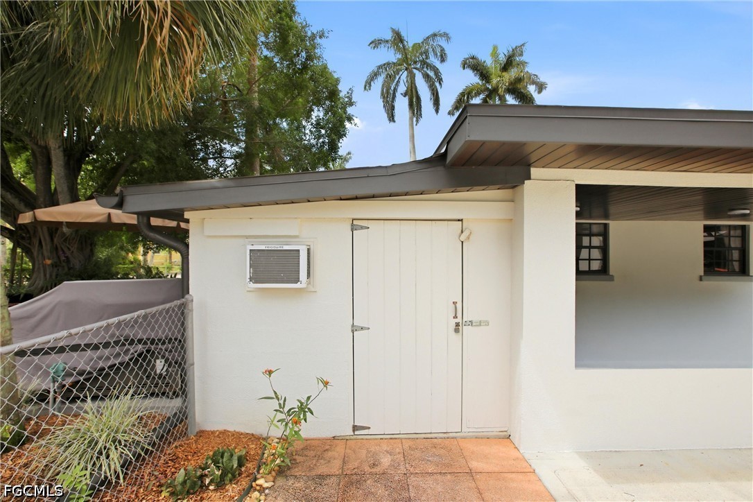 This 3-bedroom, 2-bathroom ranch-style home is set on an expansive .39-acre lot adjacent to the beautifully landscaped Triangle Park. Situated in the heart of the prestigious Dean’s Park Historic District, this charming residence captures the essence of classic Florida living. The fully fenced property provides exceptional privacy and generous outdoor space. An attached covered carport offers convenient protection, while an additional paved area allows for ample parking—ideal for multiple vehicles or a boat. Significant improvements add peace of mind, including new plumbing in 2025, a roof replaced in 2019, and a tankless water heater installed in 2023. The welcoming foyer opens into a spacious family room. Terrazzo flooring flows throughout the home, enhancing its clean lines and timeless appeal. Abundant natural light highlights the open, airy layout, while the central living space transitions seamlessly into the newly updated kitchen. Thoughtfully redesigned, the kitchen features an open layout with clear sightlines to the dining/living areas. Highlights include a professional-style stainless steel gas range with a striking stainless vent hood, generous granite countertops, under-cabinet lighting, and an expansive peninsula offering additional prep space and casual seating. Light-finished upper cabinetry, including glass-front display cabinets, is beautifully balanced by richer, darker lower cabinets for classic contrast. A tile backsplash, recessed lighting, and a window over the sink complete this stylish and functional space. The living room is anchored by a classic fireplace with a clean tiled surround set against a rich wood-paneled accent wall. The primary suite features a beautifully updated, spa-inspired bathroom. A glass-enclosed walk-in shower showcases floor-to-ceiling tile and sleek fixtures for a bright, streamlined look. A floating stone vanity with an integrated sink and contemporary hardware pairs elegantly with modern lighting and clean tile lines. Two additional guest bedrooms are generously sized and share a classic full bathroom that reflects the home’s timeless character while offering comfort and functionality. Additional interior highlights include a dedicated laundry room with utility sink. An attached utility shed adds even more convenience for tools and equipment. Step outside to a peaceful, private backyard designed for relaxation and entertaining. A spacious paver patio creates an inviting outdoor living area, ideal for gatherings or quiet evenings beneath mature trees. Lush landscaping and established greenery frame the yard, highlighted by a stunning oversized shade tree that provides year-round comfort. The expansive lawn offers ample room for recreation, gardening, or future enhancements, all while maintaining a serene, park-like atmosphere. Completing the outdoor space is a 160-square-foot detached shed with electric.
