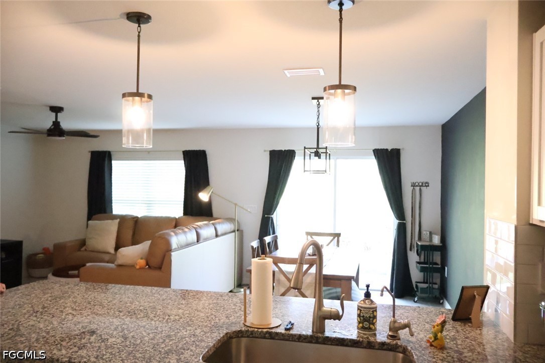 Step inside to an open-concept main living area featuring durable tile flooring and a functional layout. The kitchen is designed for both everyday living and entertaining, complete with granite countertops, recessed LED lighting, full-overlay cabinetry, and stainless-steel appliances.