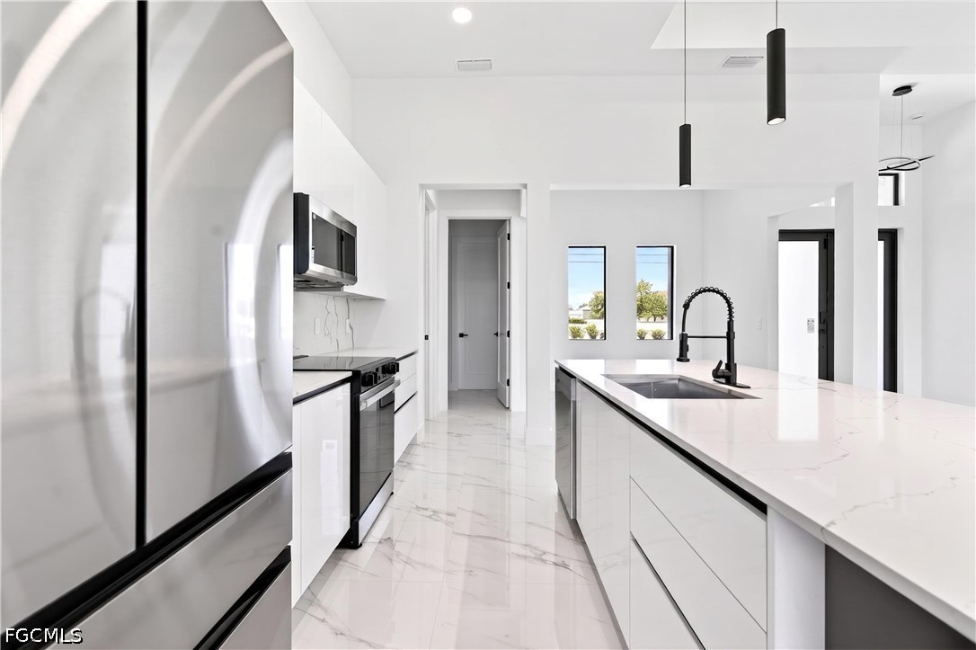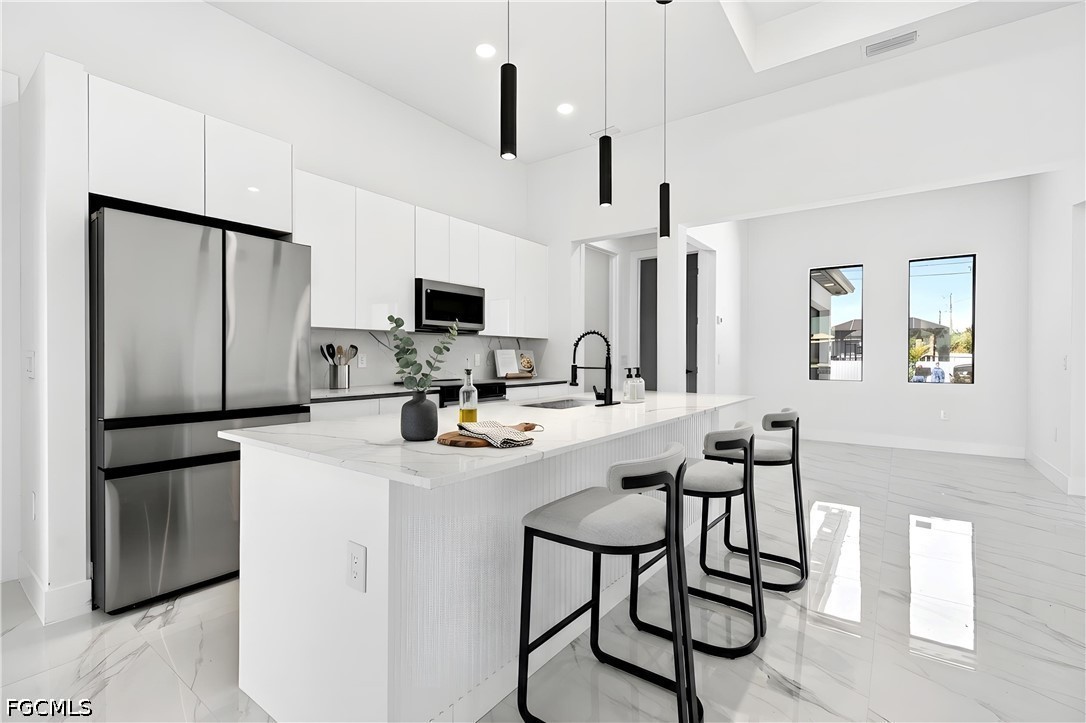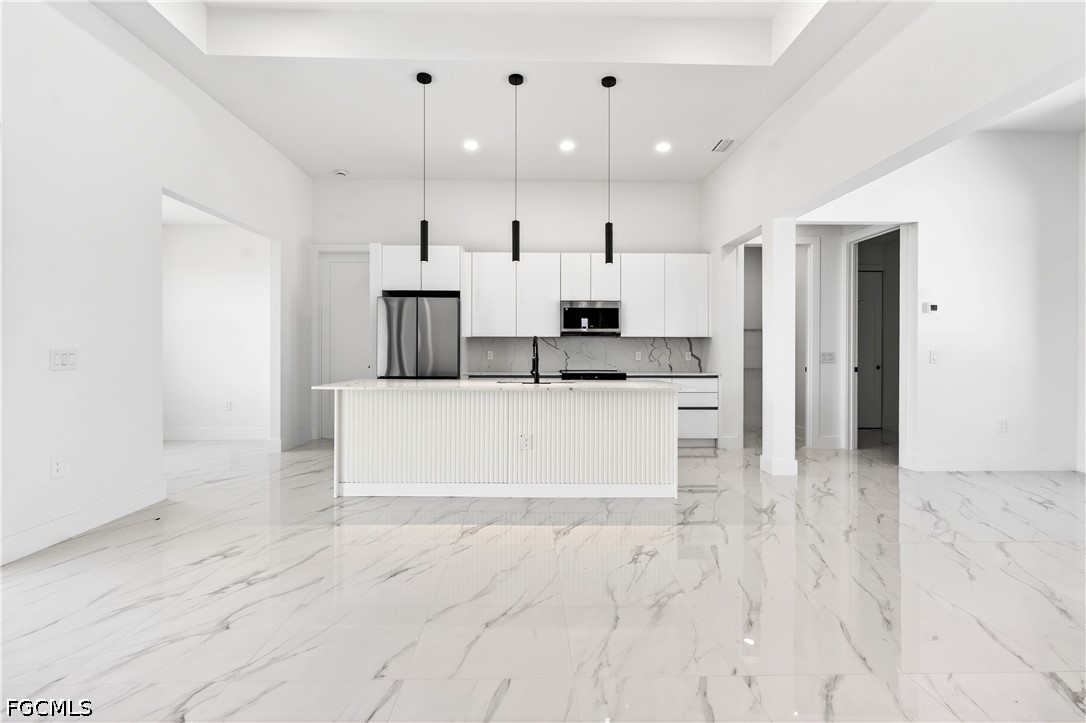 The kitchen is a true focal point, featuring sleek European-style cabinetry, stainless steel appliances, a wine cooler, and a spacious pantry—designed for both functionality and style.