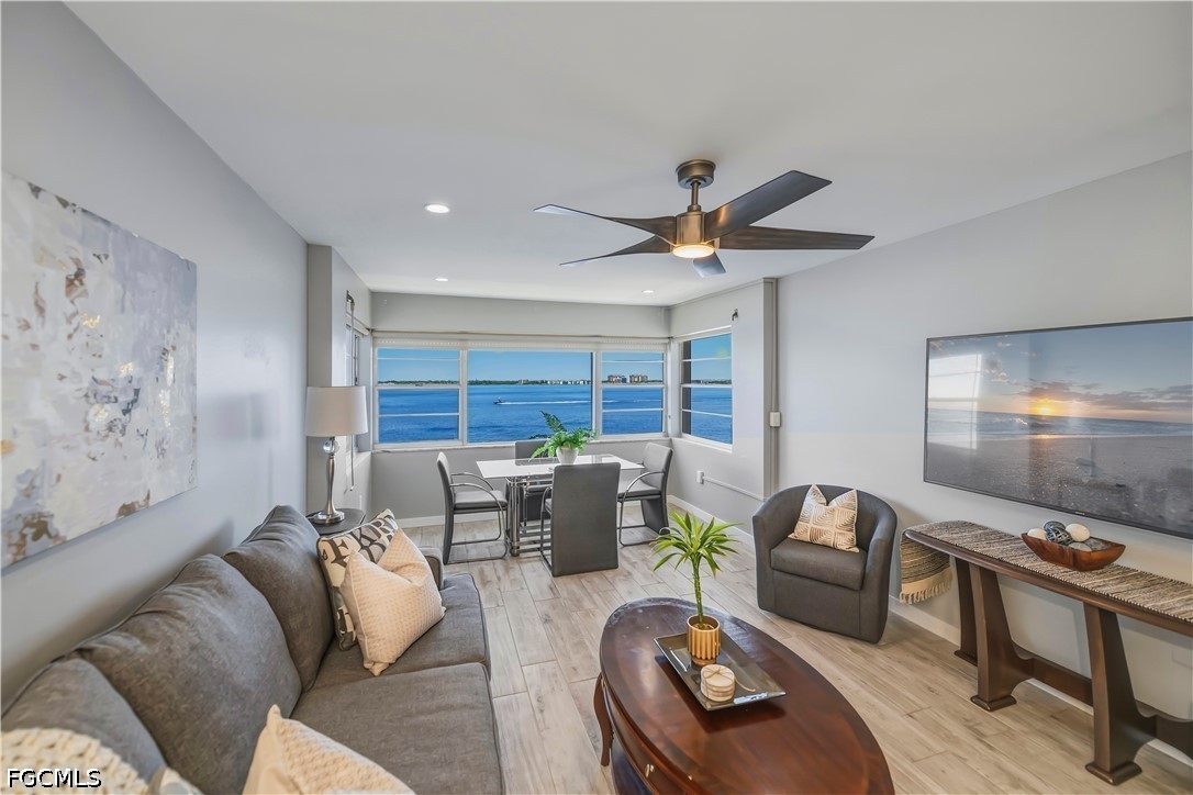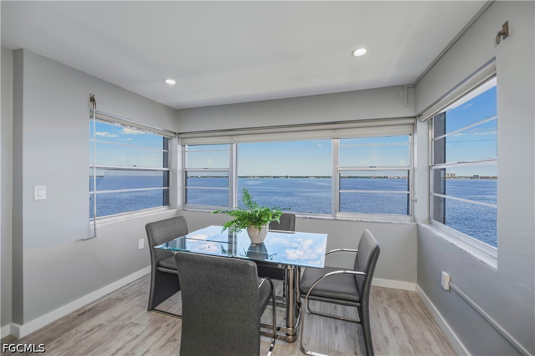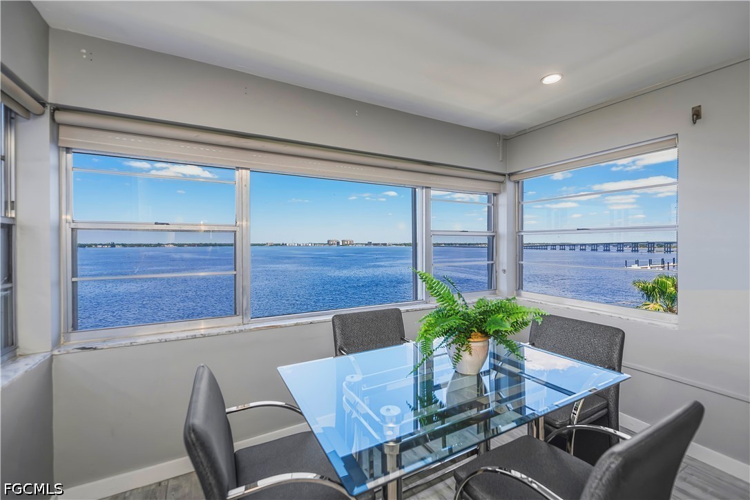 Experience elevated waterfront living on the Caloosahatchee River from this beautifully updated 5th-floor, fully furnished 2-bedroom condo, ideally located just minutes from Downtown Ft. Myers. From the moment you enter, you’re greeted with panoramic river views from every room, filling the space with natural light and creating a peaceful, coastal atmosphere. End each day with breathtaking Southwest Florida sunsets, painting the sky just beyond your windows—an everyday luxury that never gets old. The thoughtfully designed interior offers a bright, open-concept layout perfect for both relaxing and entertaining. The updated kitchen features quartz countertops, stainless steel appliances, and modern cabinetry, flowing seamlessly into the living and dining areas where the water views take center stage. Both bedrooms are generously sized and positioned to capture those same serene river views, offering a true retreat-like feel. An in-unit washer and dryer adds to the ease and convenience of everyday living. This well-maintained community is designed to complement the Florida lifestyle, offering a heated pool perfect for enjoying sunny afternoons, along with a community dock and fishing pier where you can spend your time fishing, watching boats cruise by, or simply soaking in the tranquil waterfront setting. The building also features secure, controlled entry and elevator access, providing both comfort and peace of mind, and the unit includes a covered parking space—a valuable and convenient feature. Set within an up-and-coming waterfront neighborhood, this location offers the perfect blend of relaxed surroundings and accessibility. Enjoy the ease of being within walking distance to coffee shops, local breweries, and Publix, while still being just a short drive or bike ride to the vibrant Downtown Ft. Myers River District, known for its dining, entertainment, and nightlife. Rent includes water, sewer, trash, and access to community amenities, allowing for a truly low-maintenance, lock-and-leave lifestyle. This condo offers a rare opportunity to enjoy stunning river views, unforgettable sunsets, and effortless waterfront living in one of Ft. Myers’ most desirable and evolving area.